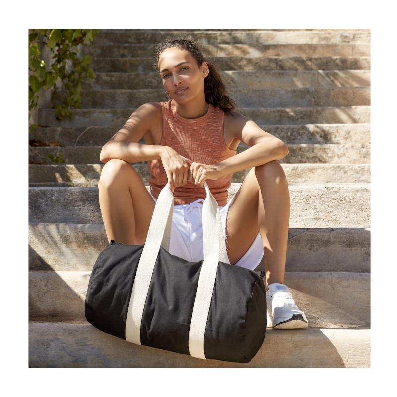 Fermeture Éclair®. Coton certifié par Control Union. Surface d'impression : en bout du sac 15x15cm et au milieu 13x12cm.