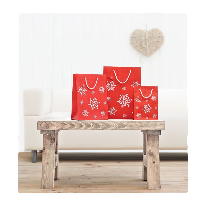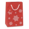 Elégant sac cadeau en papier décoré de motifs de flocons de neige. Petite carte message incluse. Petit modèle.