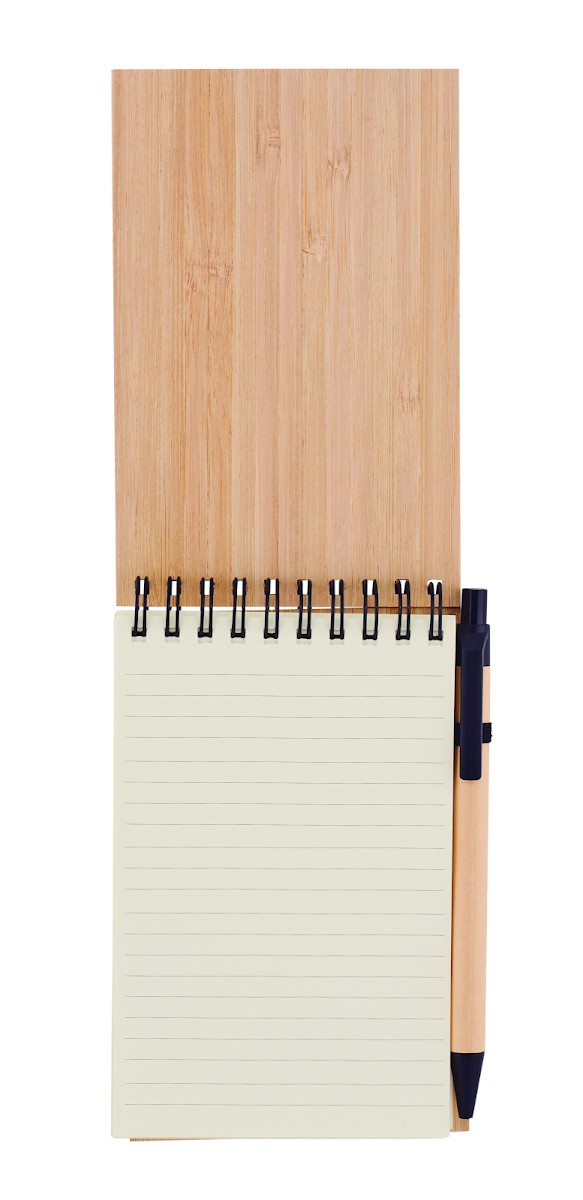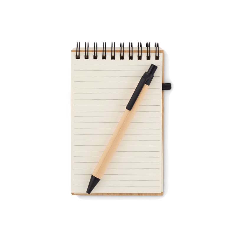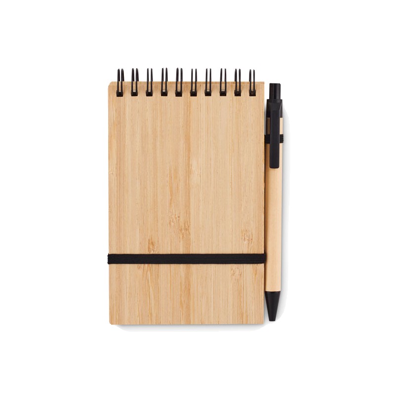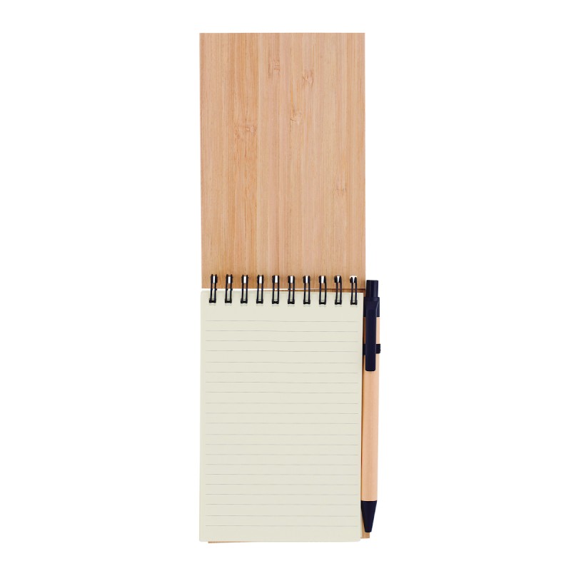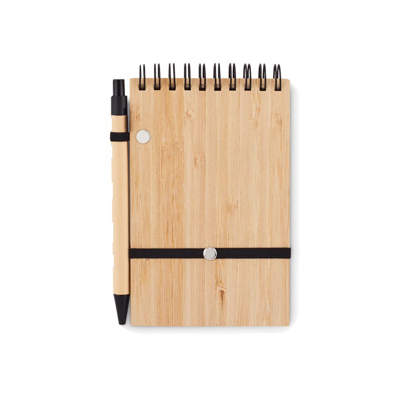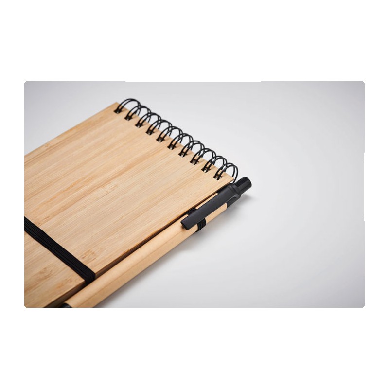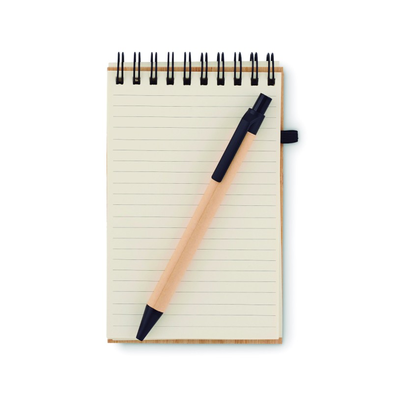 Bloc-notes A6 avec couverture rigide en bambou. Double fil. 140 pages en papier recyclé ordinaire (70 feuilles). Stylo à bille assorti avec bouton poussoir, corps en papier recyclé et détails en PLA. Encre bleue. Bande élastique de fermeture et porte-stylo. Le bambou est un produit naturel, et présente de légères variations de couleur, de décoration et de tailles.