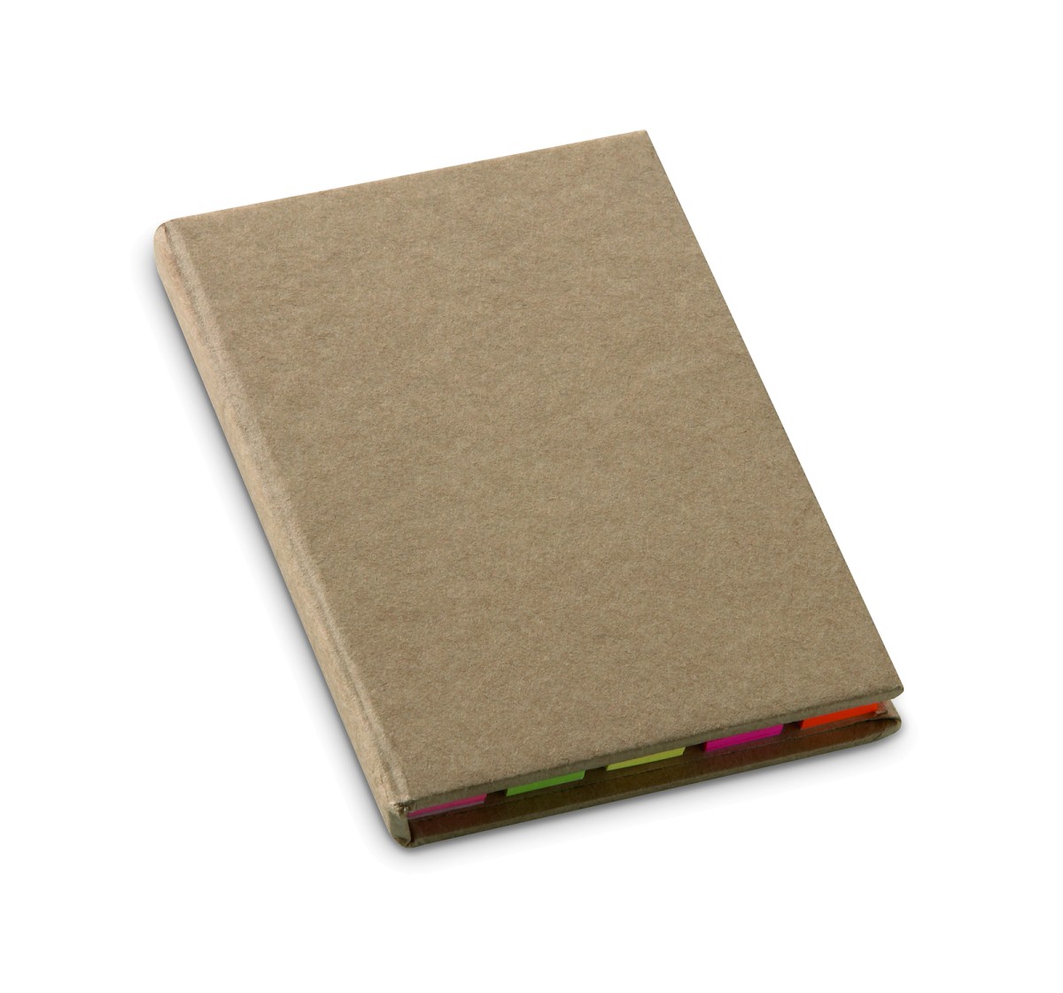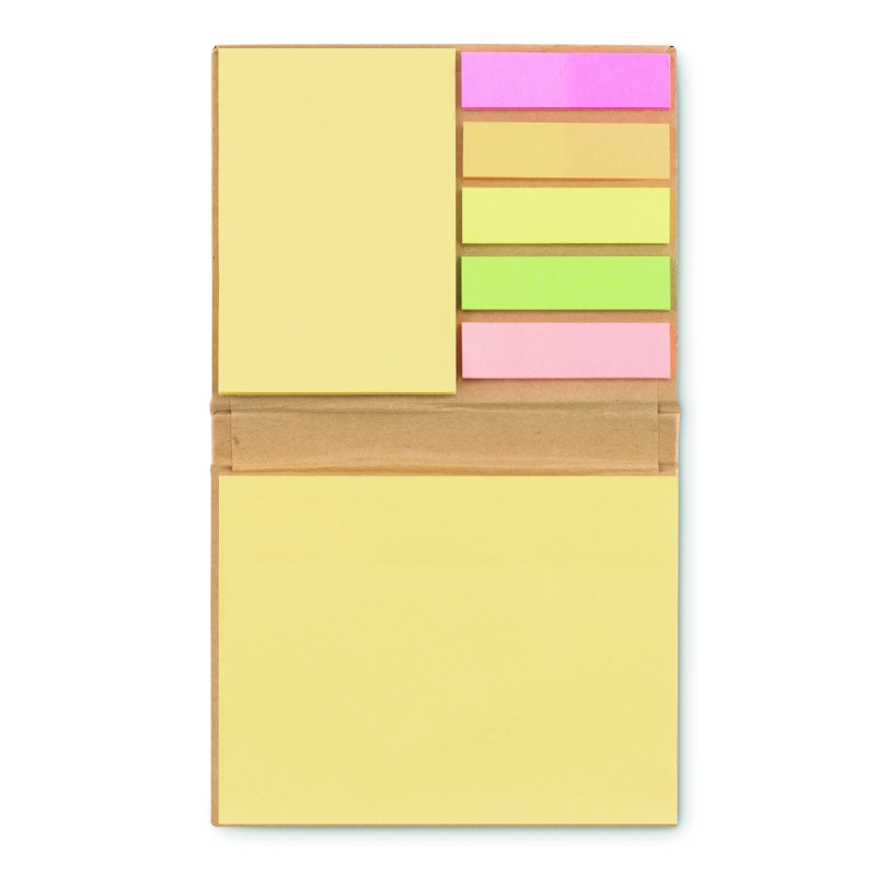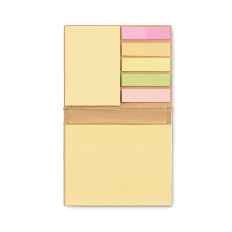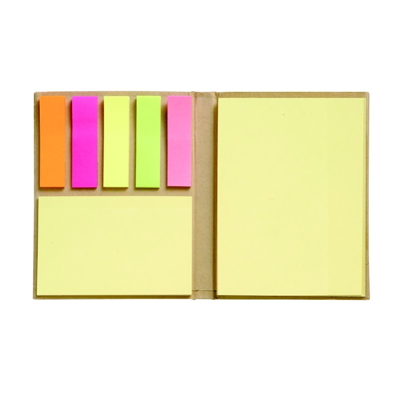 Bloc de notes adhésives 3 pièces avec couverture en carton recyclé. Blocs d'adhésifs jaunes grand et moyen et 5 marqueurs de pages de couleurs assorties.