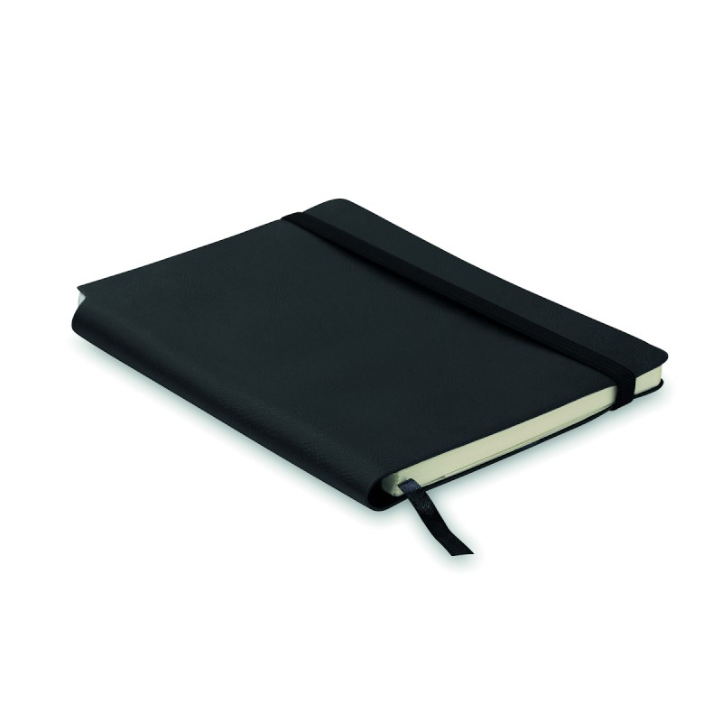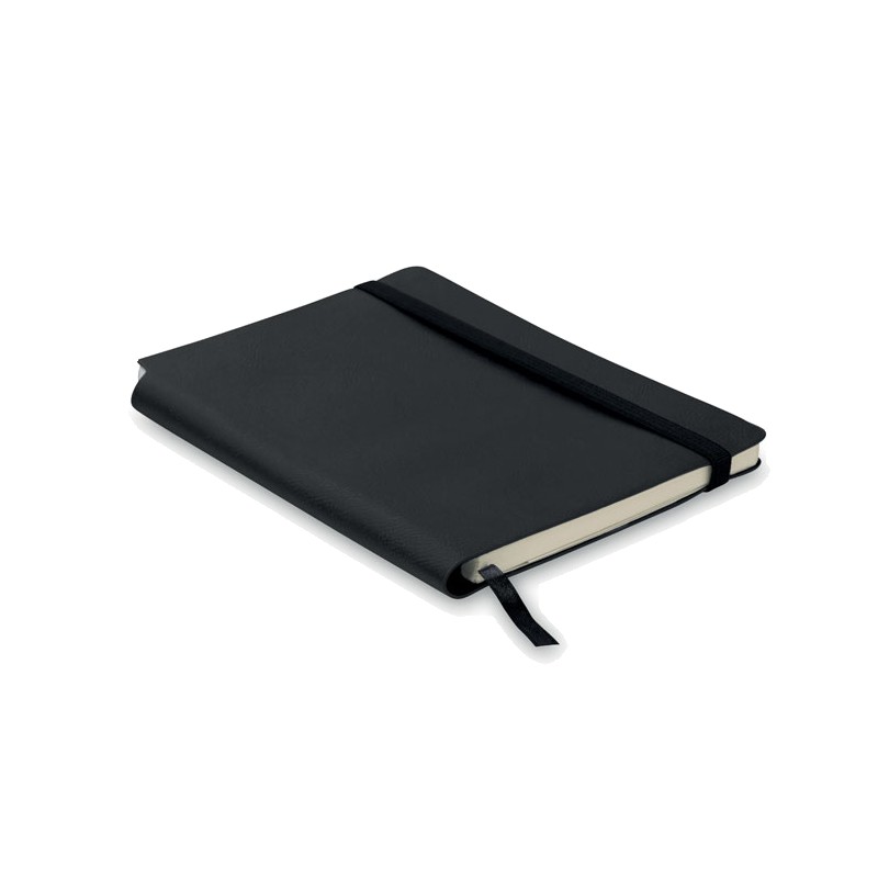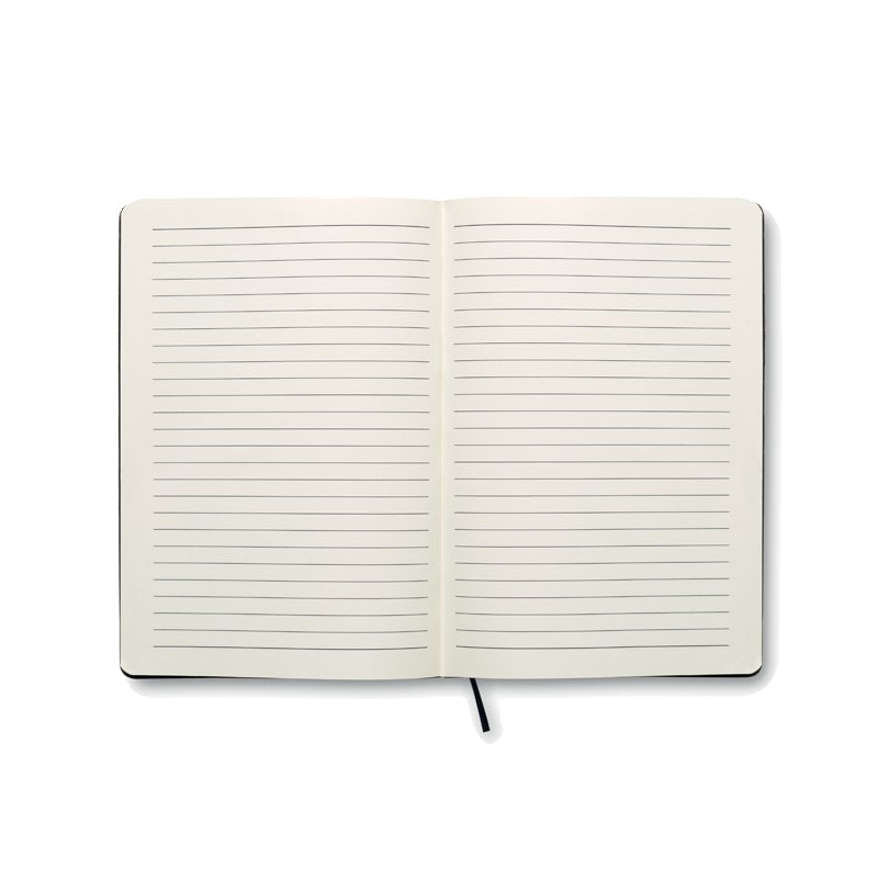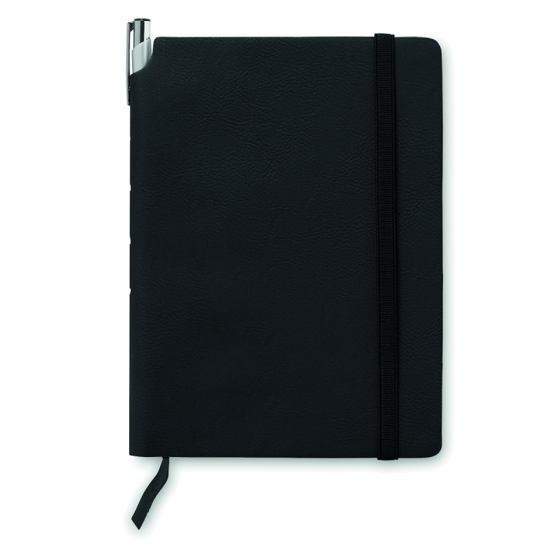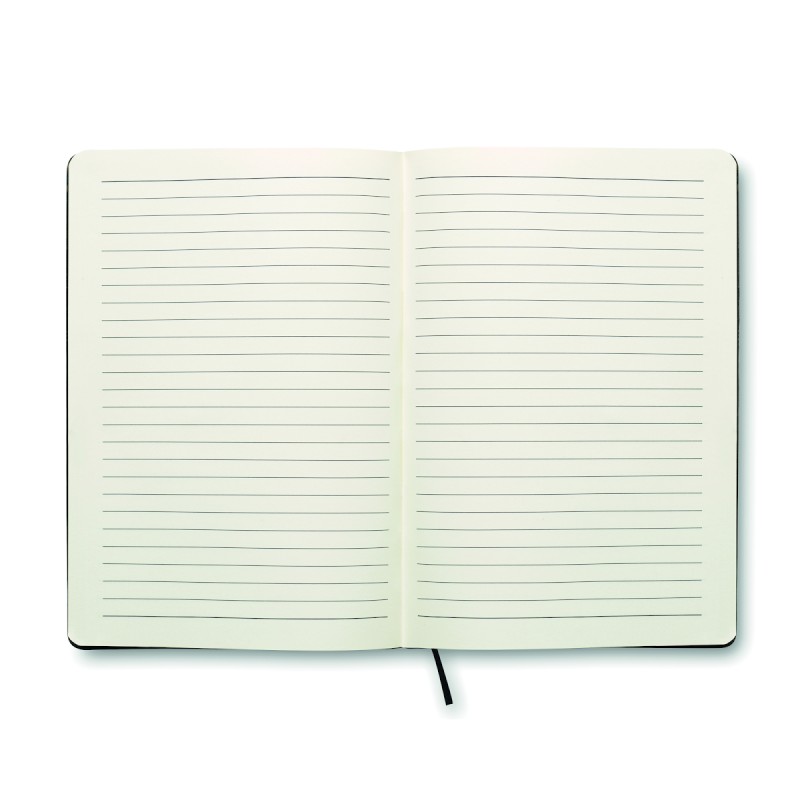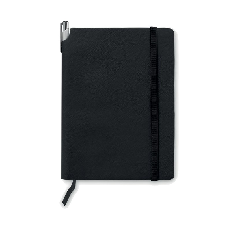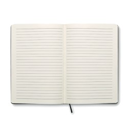 Carnet A5 avec couverture souple en PU. 160 pages lignées (80 feuilles en papier recyclé). Bande élastique de fermeture et marque-page en ruban assortis. Poche intérieure extensible au dos. Porte-stylo sur la tranche.