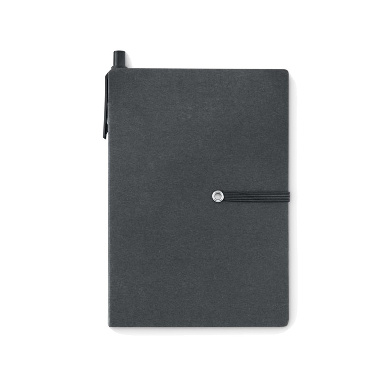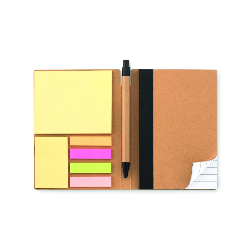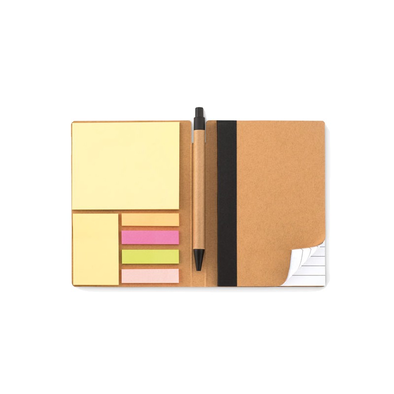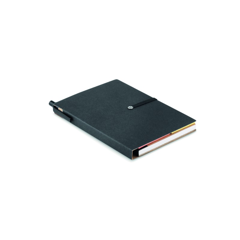 Carnet avec bloc de notes adhésives et stylo. Carnet à couverture souple en carton recyclé. 140 pages lignées (70 feuilles en papier recyclé). Blocs d'adhésifs grands et moyens et marqueurs de pages de 4 couleurs assorties. Stylo à bille à bouton poussoir assorti en carton recyclé et détails en ABS. Encre noire. Fermeture par bande élastique assortie.