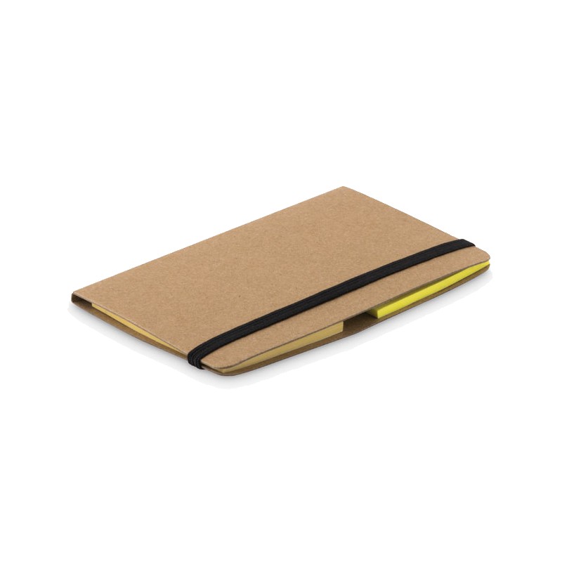 Set memo et porte-cartes en papier kraft. Blocs de notes adhésives jaunes en papier recyclé de taille moyenne et marqueurs de pages de 5 couleurs assorties. Bande élastique de fermeture.