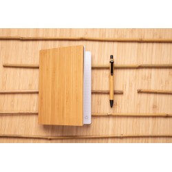 Carnet de notes A5 avec couverture en bambou avec 90 feuilles/180 pages de70g/m² (papier crème). Stylo en bambou avec encre noire. Livré dans une boite cadeau en kraft.