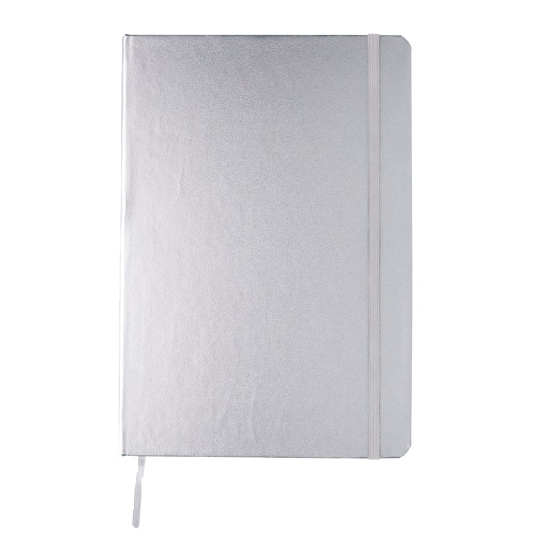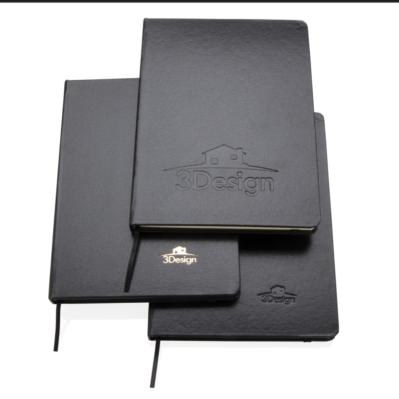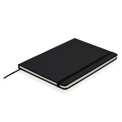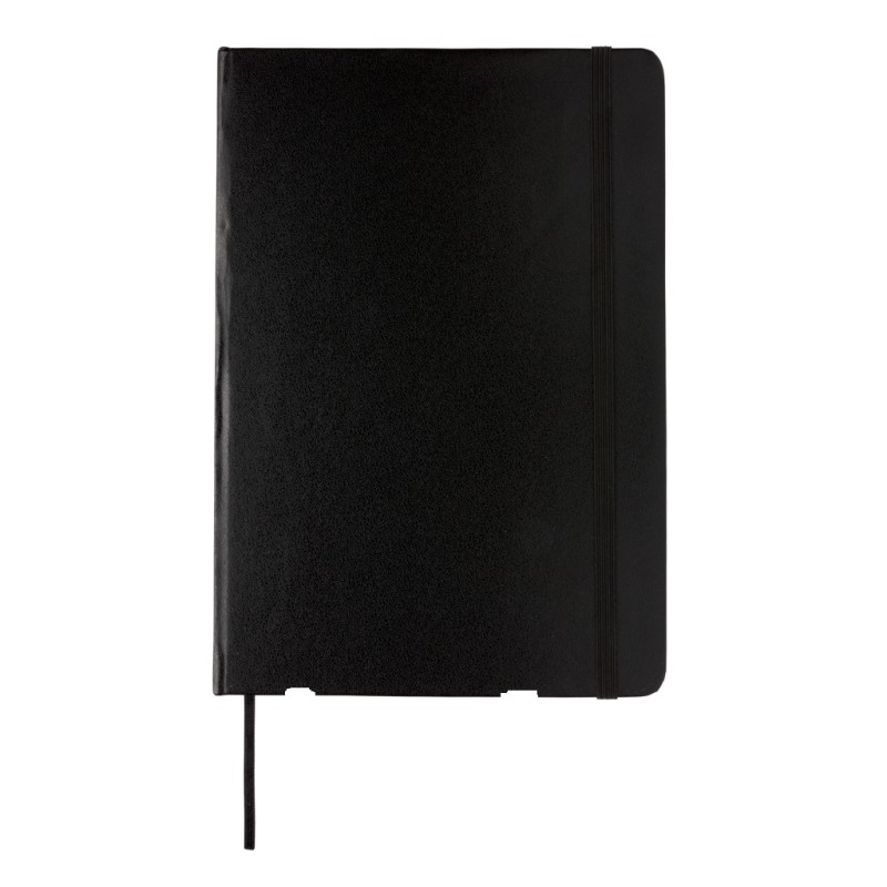 Carnet de notes A5 à couverture rigide avec bande élastique avec 72 feuilles/144 pages de 70g/m² (papier crème), lignes noires et marque-page.