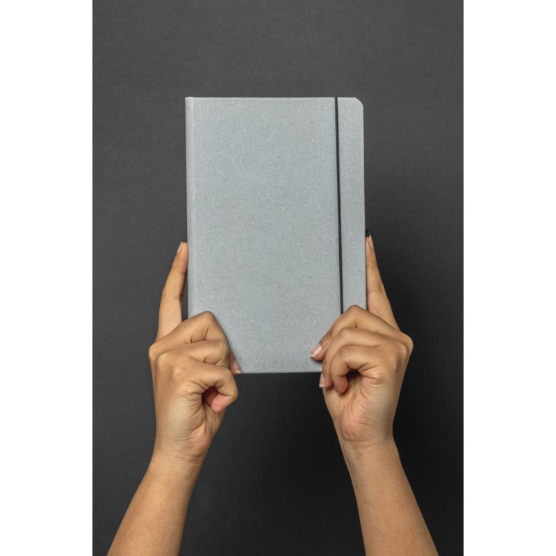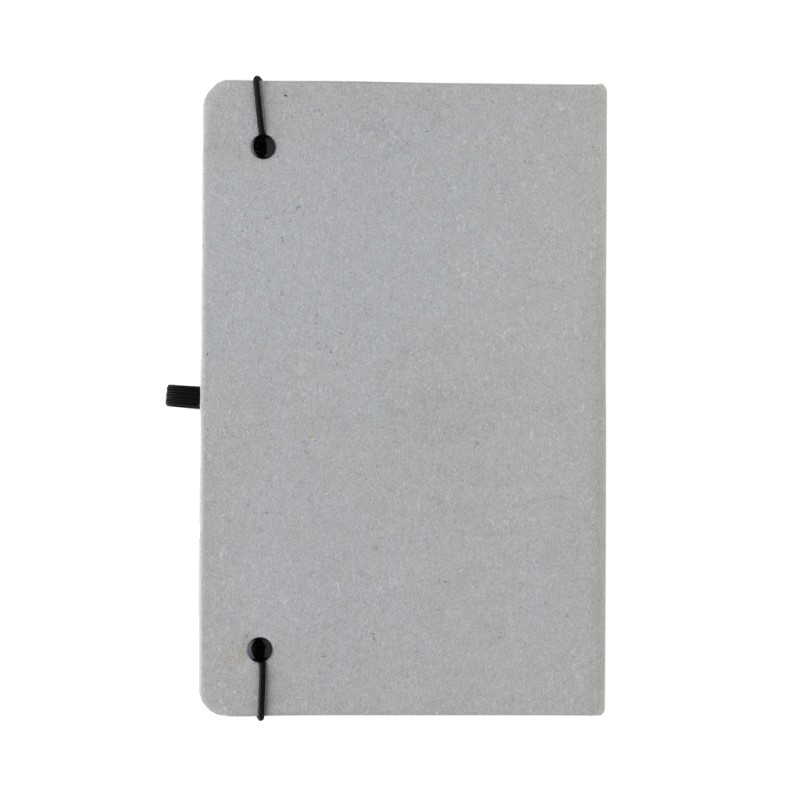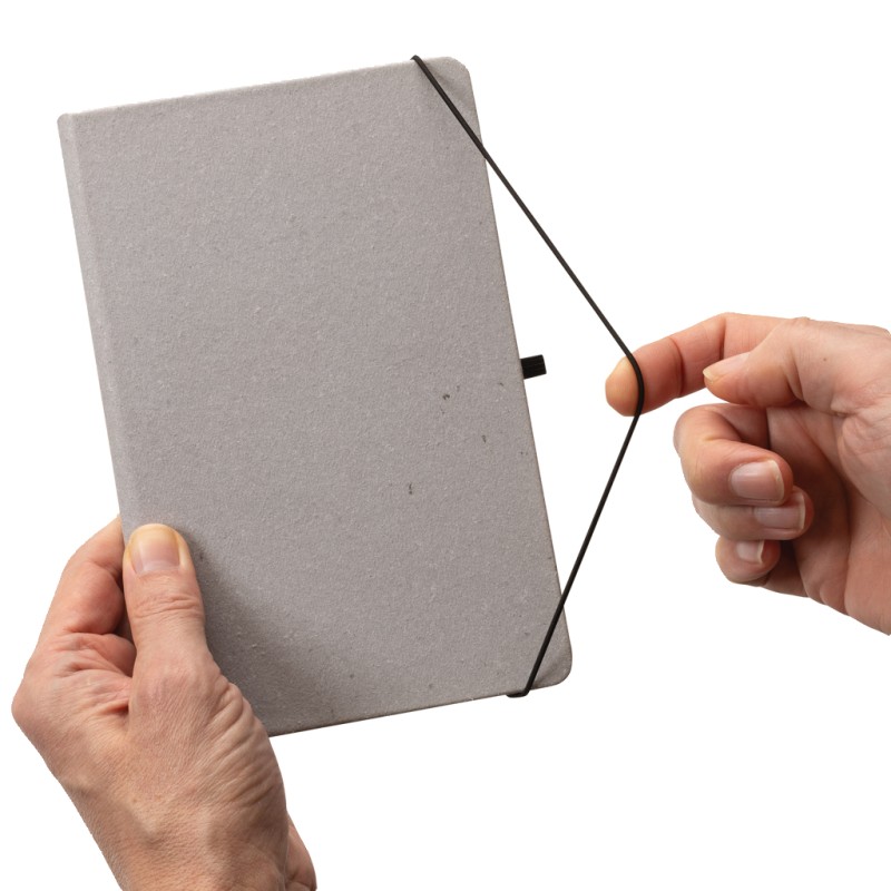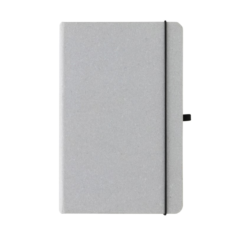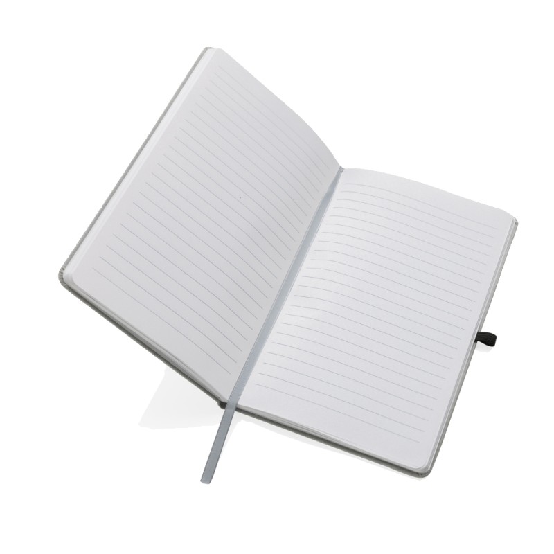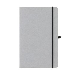 Carnet A5 en cuir recyclé. Élégant et bien fini avec 80 feuilles/160 pages de 70 g/m2 de papier recyclé ligné de couleur blanche, un élastique vertical et un passant stylo. Emballé sans plastique dans une pochette FSC.