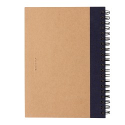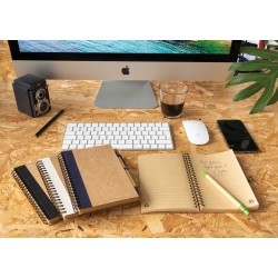 Cahier à spirales avec 70 feuilles/140 pages ligné 70g/m² (papier crème recyclé). Le cahier est équipé d'un stylo à bille kraft de couleur assortie. La longueur d'écriture du stylo est de 600m avec de l'encre bleue allemande Dokumental.