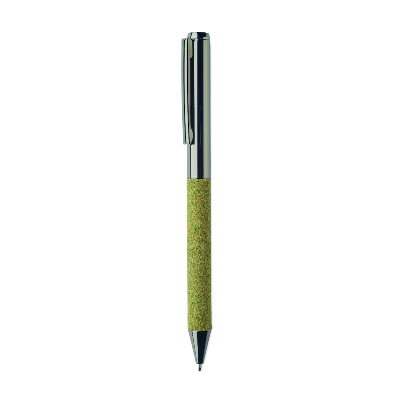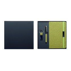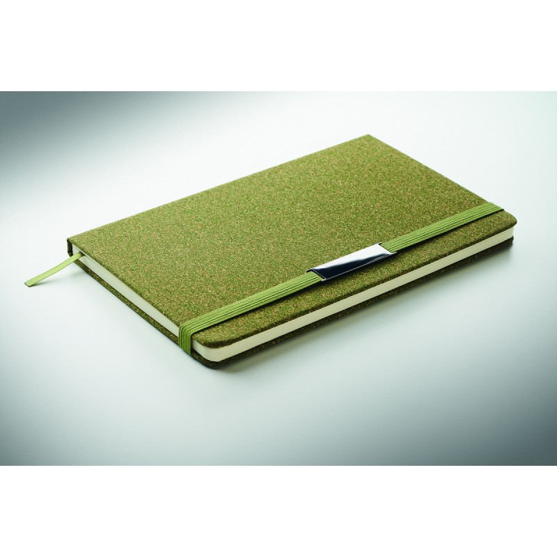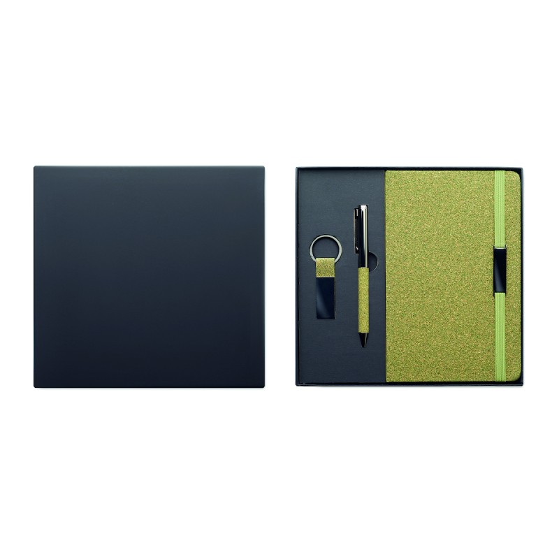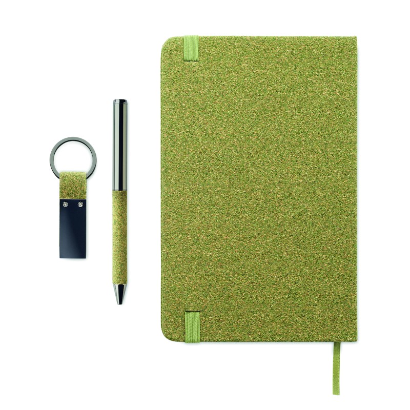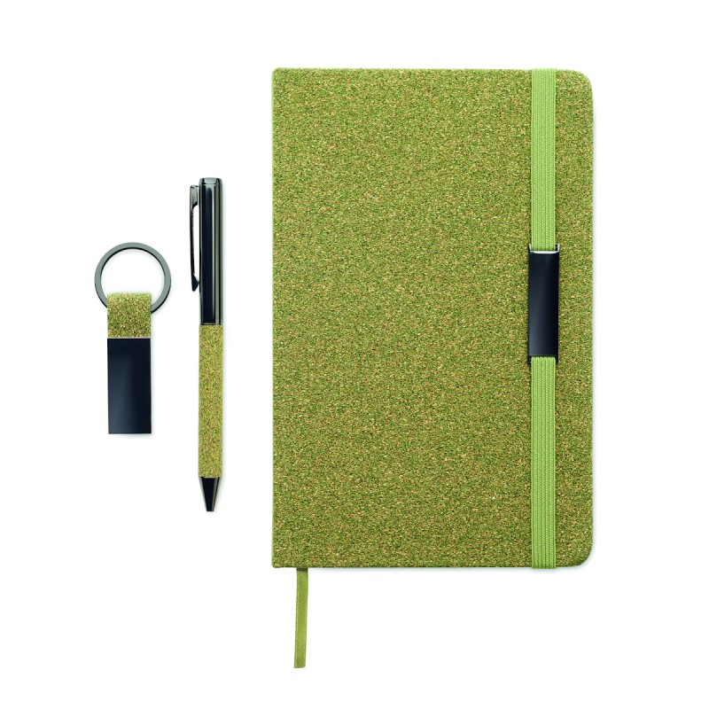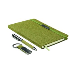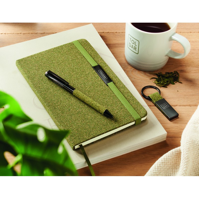 Set composé d'un carnet A5 à couverture rigide, 160 pages lignées en papier recyclé (80 feuilles/70 g/m²), d'un stylo-bille en métal et d'un porte-clés. Détail en 20% de marc de thé, 30% de liège, 50% en polycoton. Détail métallique sur la sangle élastique. FSC®-certified | FSC MIX CREDIT, N7.1, FSC-C213206