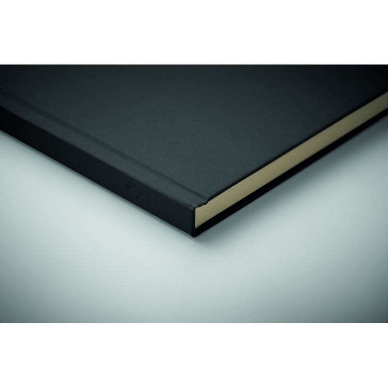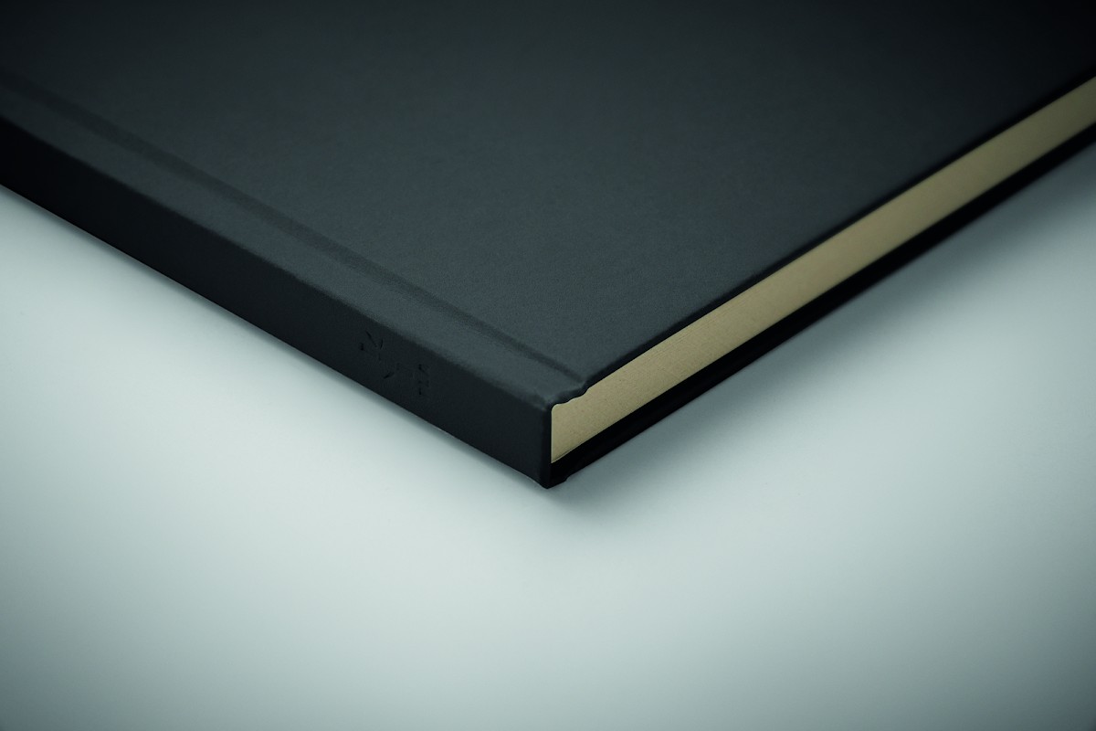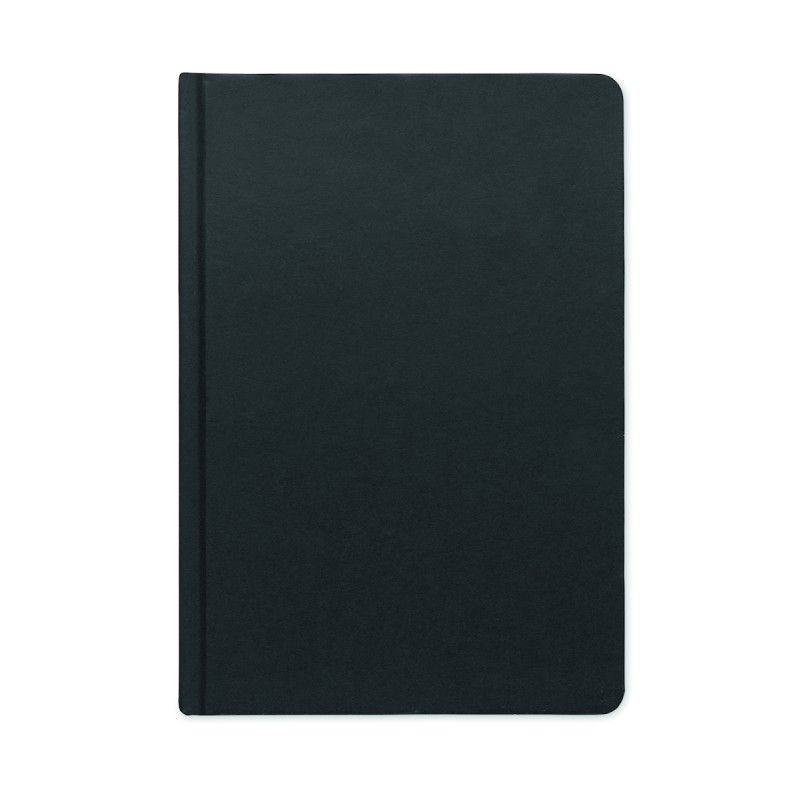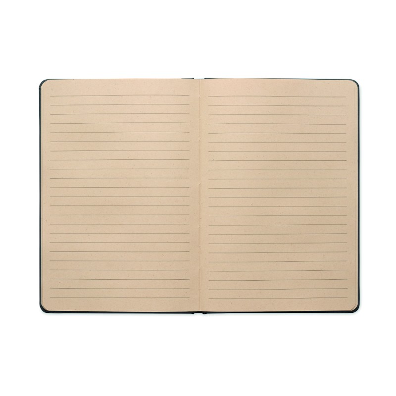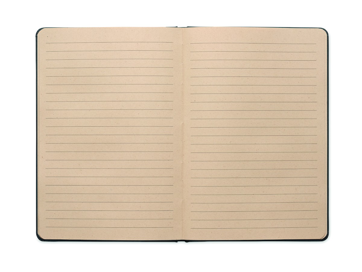 Carnet A5 avec couverture rigide et 160 pages lignées (80 feuilles) en PLA canne à sucre (65% fibre de canne à sucre/35% papier). Reliure dos collé.