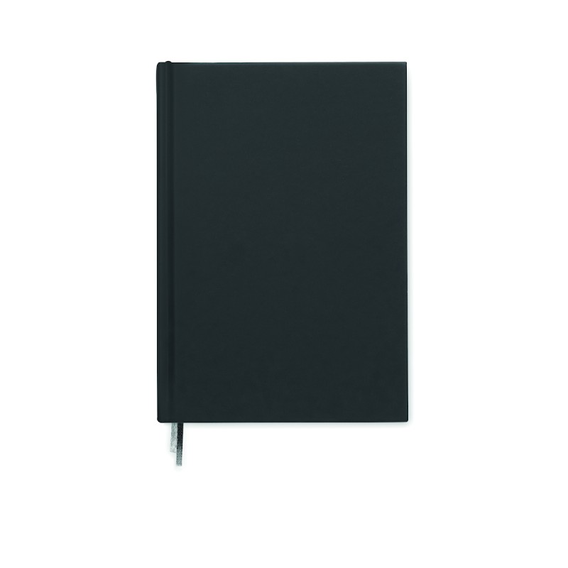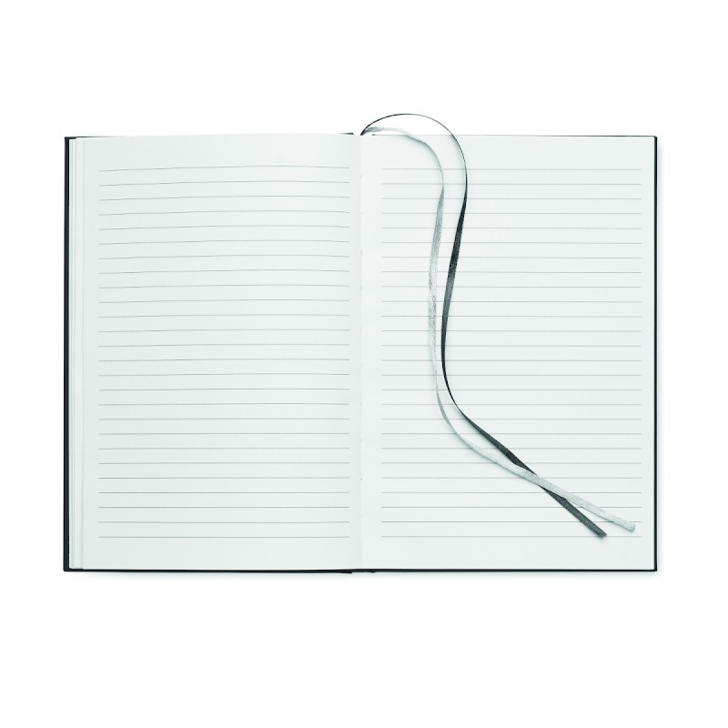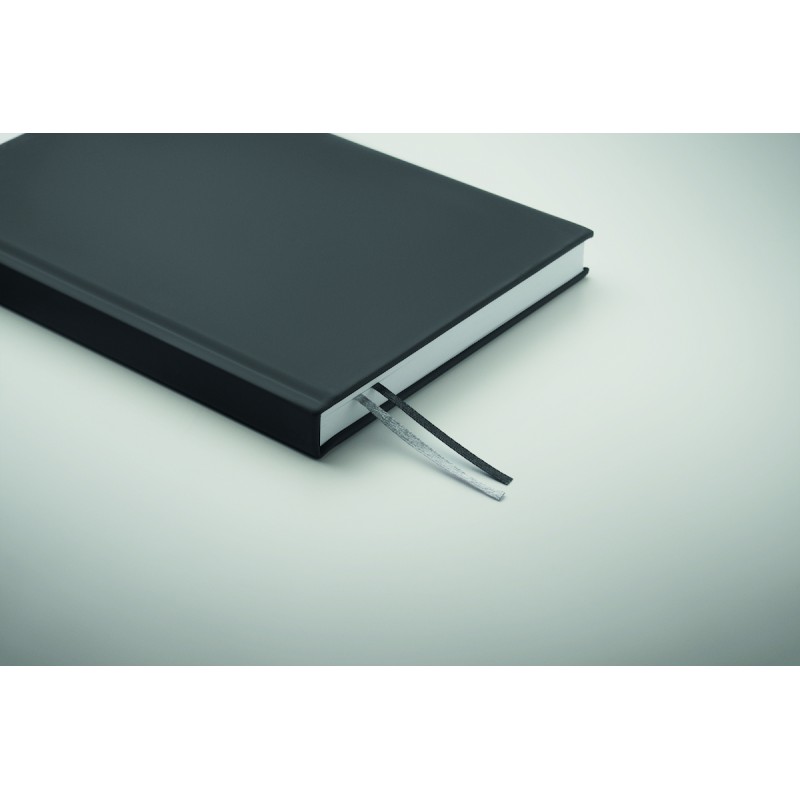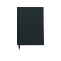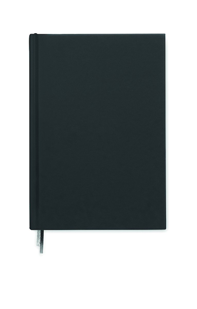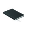 Carnet A5 en polyester post-consommation recyclé à 60 % et couverture en PU à 40 %. Reliure dos collé. 256 pages lignées en papier recyclé 70gr/m² (128 feuilles). Avec 2 rubans marque page.