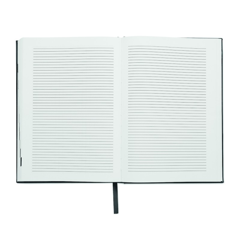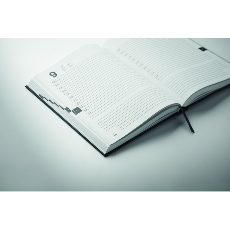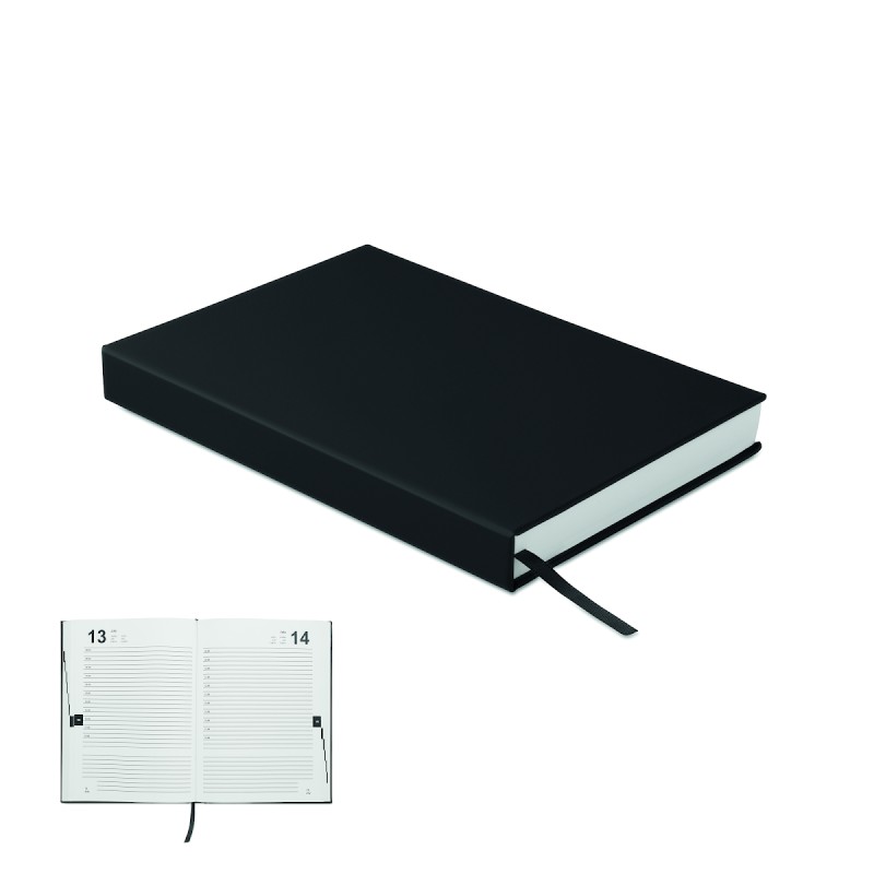 Agenda A5 perpétuel en polyester post-consommation recyclé à 60 % et couverture en PU à 40 %. 416 pages universelles en papier recyclé 70gsm (208 feuilles). Marque page en polyester de couleur assortie.