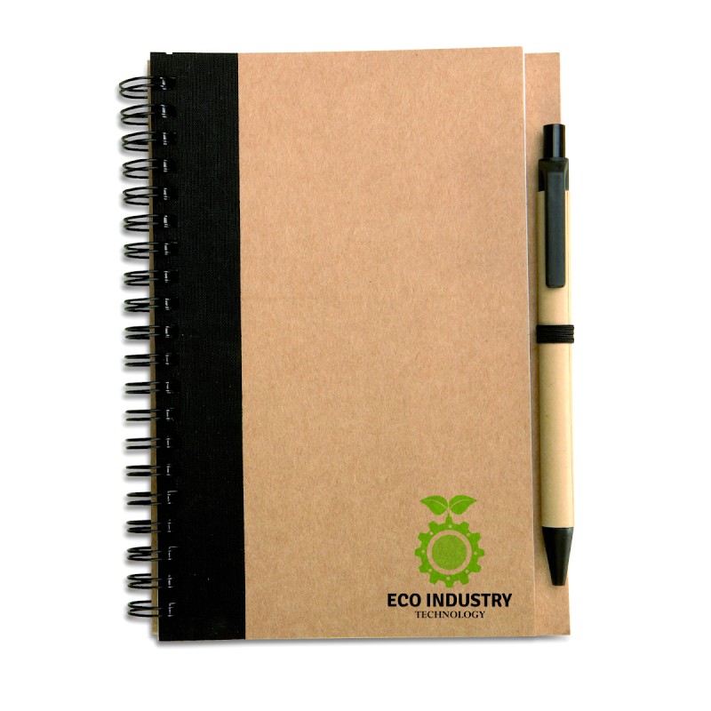 Carnet à spirale en papier recyclé avec stylo assorti. 140 pages en papier recyclé ordinaire (70 feuilles). Stylo à bille à bouton poussoir assorti en carton recyclé et plastique biodégradable. Encre bleue. Passant à stylo élastique assorti.