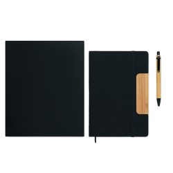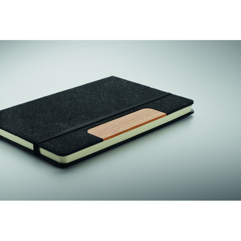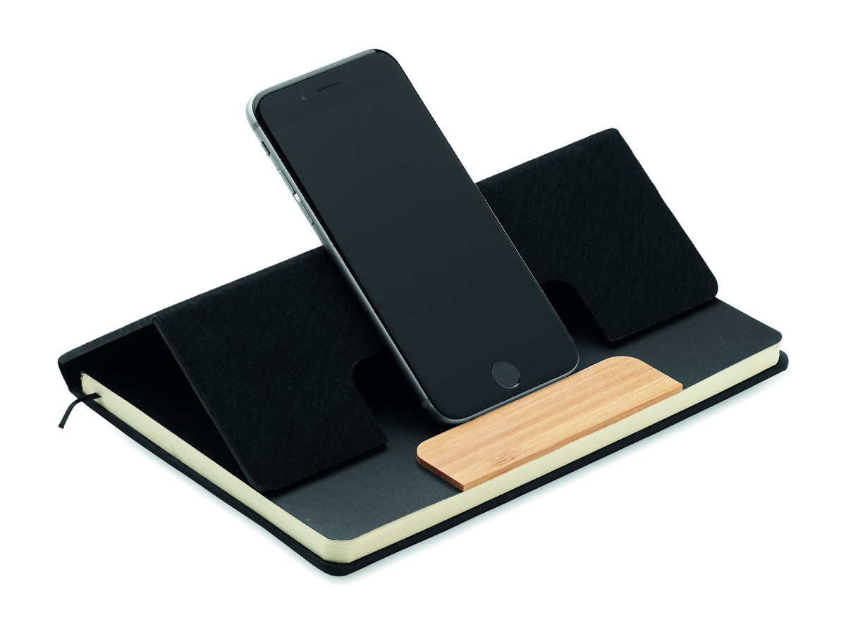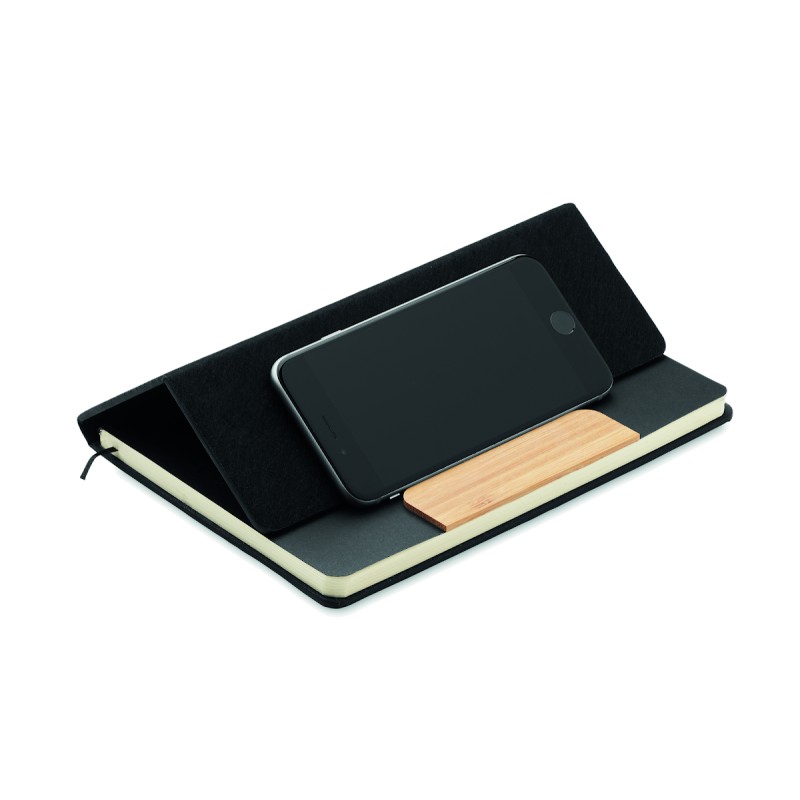 Set de carnets A5 en feutre RPET à couverture rigide avec fonction support de téléphone et stylo à bille en bambou. Reliure cartonnée. 160 pages lignées en papier recyclé (80 feuilles). Fermeture élastique. Marque-page en ruban. Encre bleue.