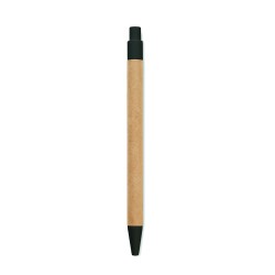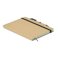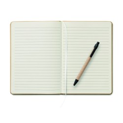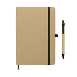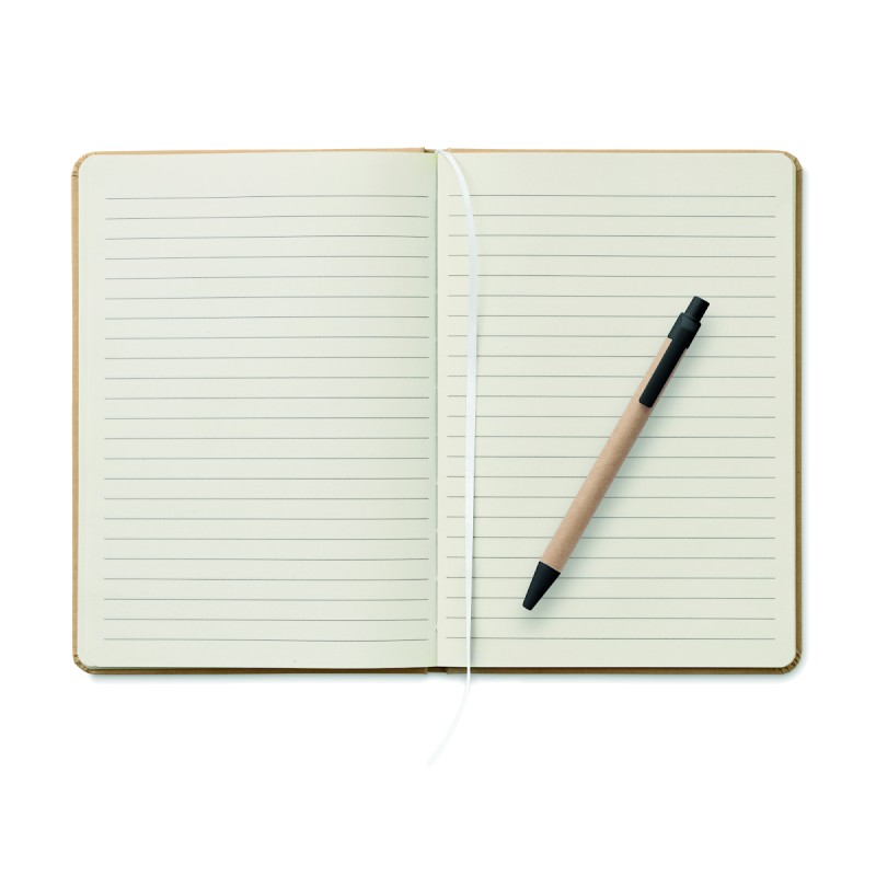 Carnet A5 avec couverture rigide en carton recyclé. Relié par un étui. 160 pages lignées (80 feuilles de papier recyclé). Fermeture élastique, boucle pour stylo, ruban marque-page. Comprend un stylo à bille à bouton-poussoir avec corps en papier recyclé. Encre bleue.