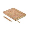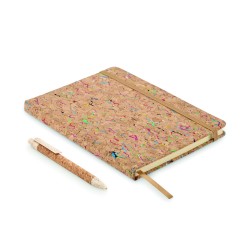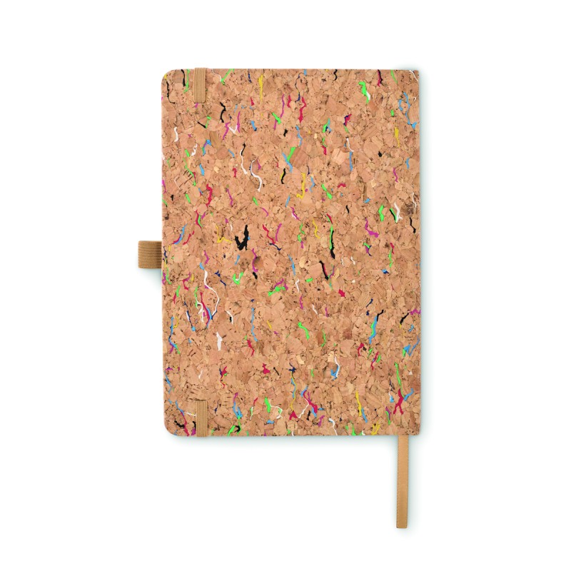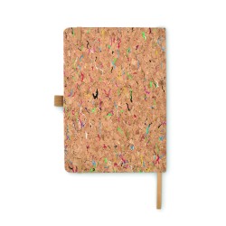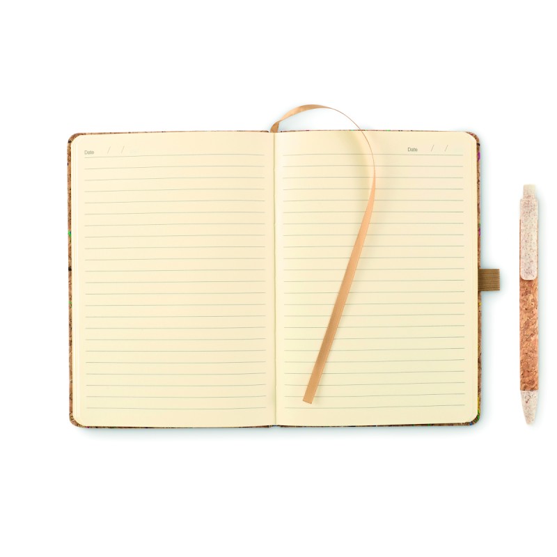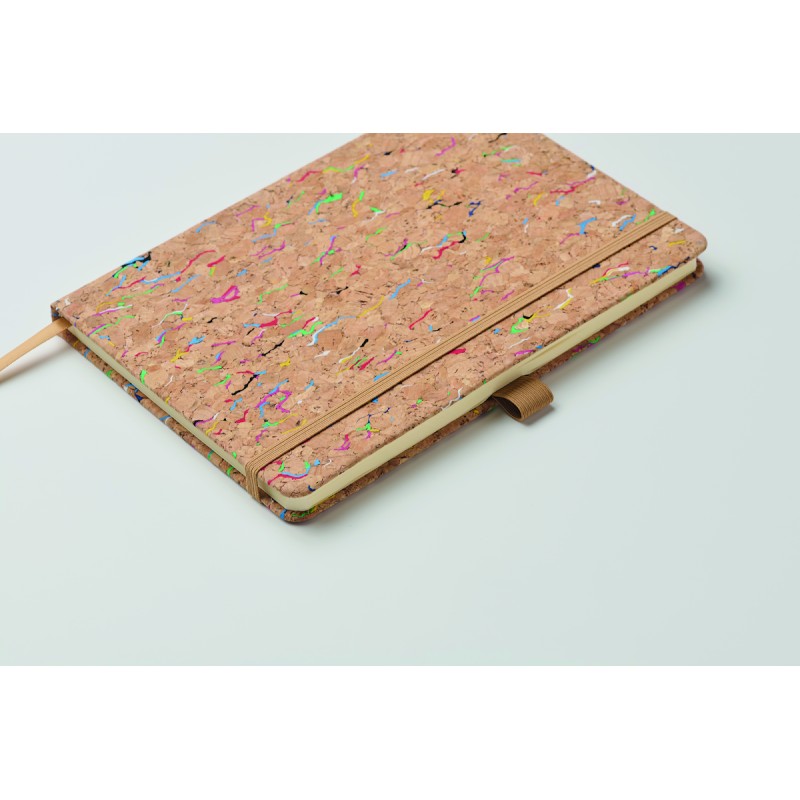 Carnet A5 avec couverture en liège rigide et colorée. Reliure dos collé. 192 feuilles lignées (96 feuilles). Fermeture élastique, marque page en ruban et porte-stylo élastique.