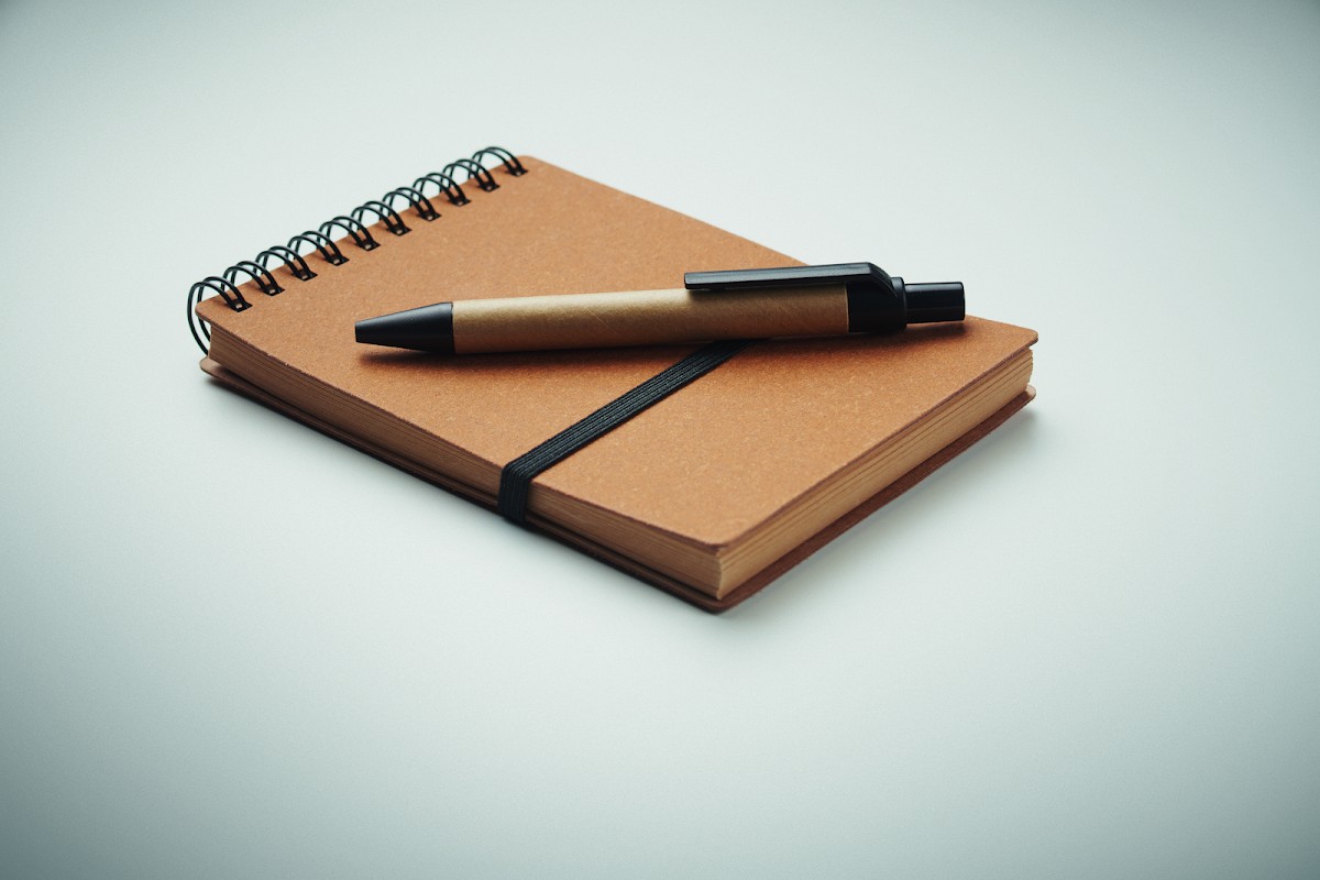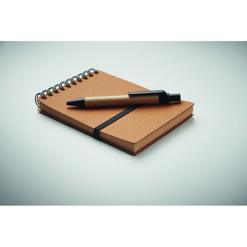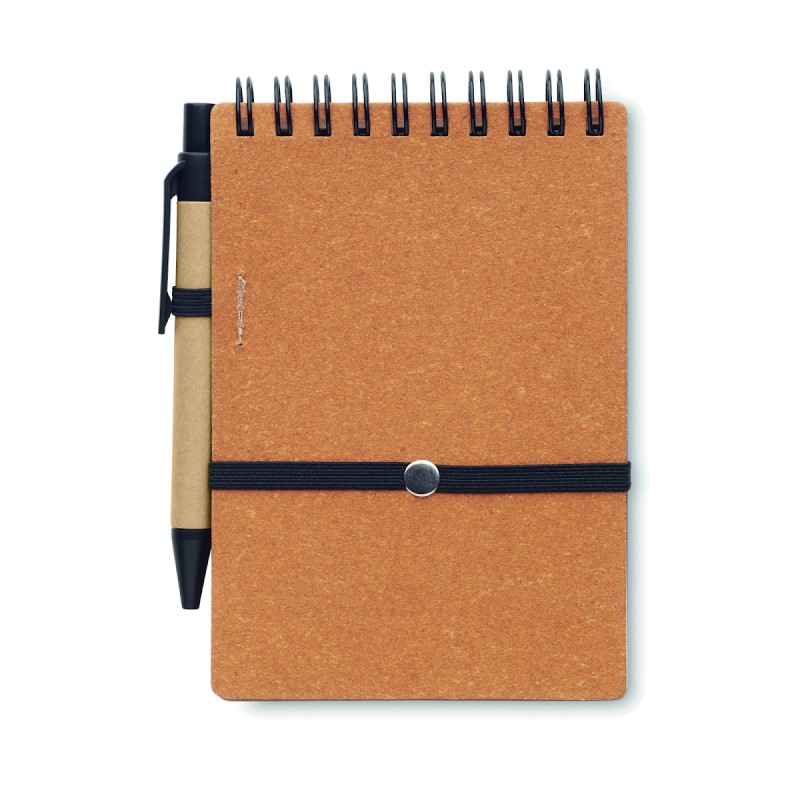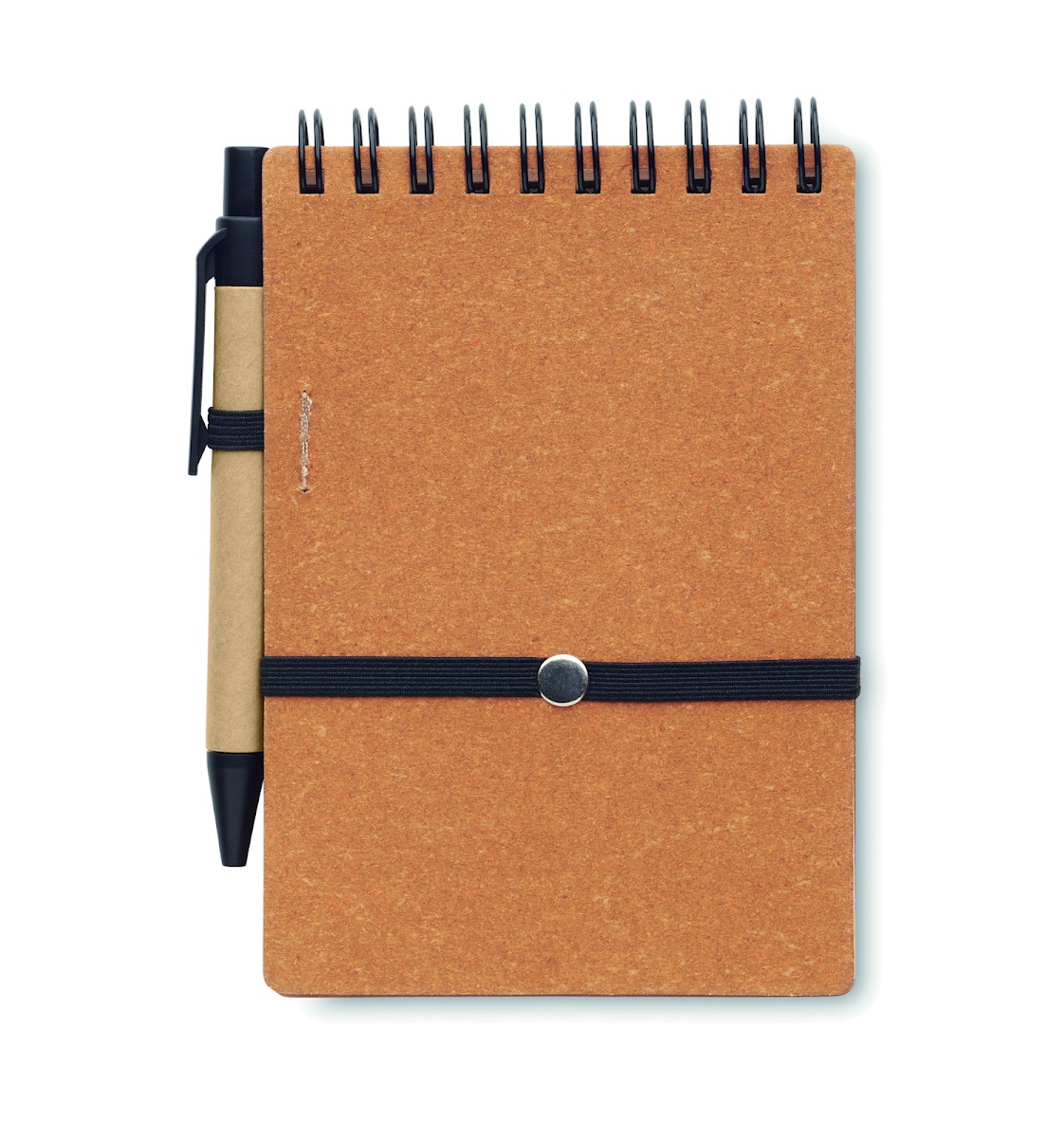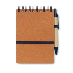 Carnet avec papier recyclé et couverture en PU (70 % de papier recyclé et 30 % de PU). Reliure à spirale. 140 pages lignées en papier recyclé (70 feuilles). Stylo bille à bouton poussoir assorti en carton recyclé et pièces en ABS. Encre bleue. Fermeture élastique et porte-stylo.