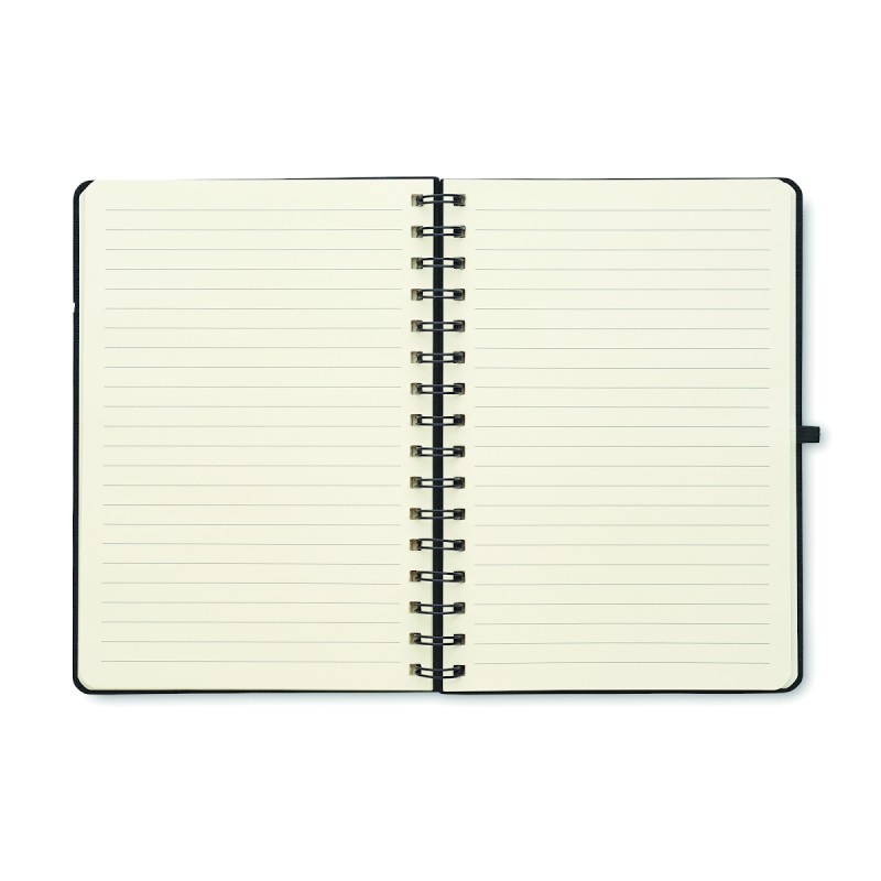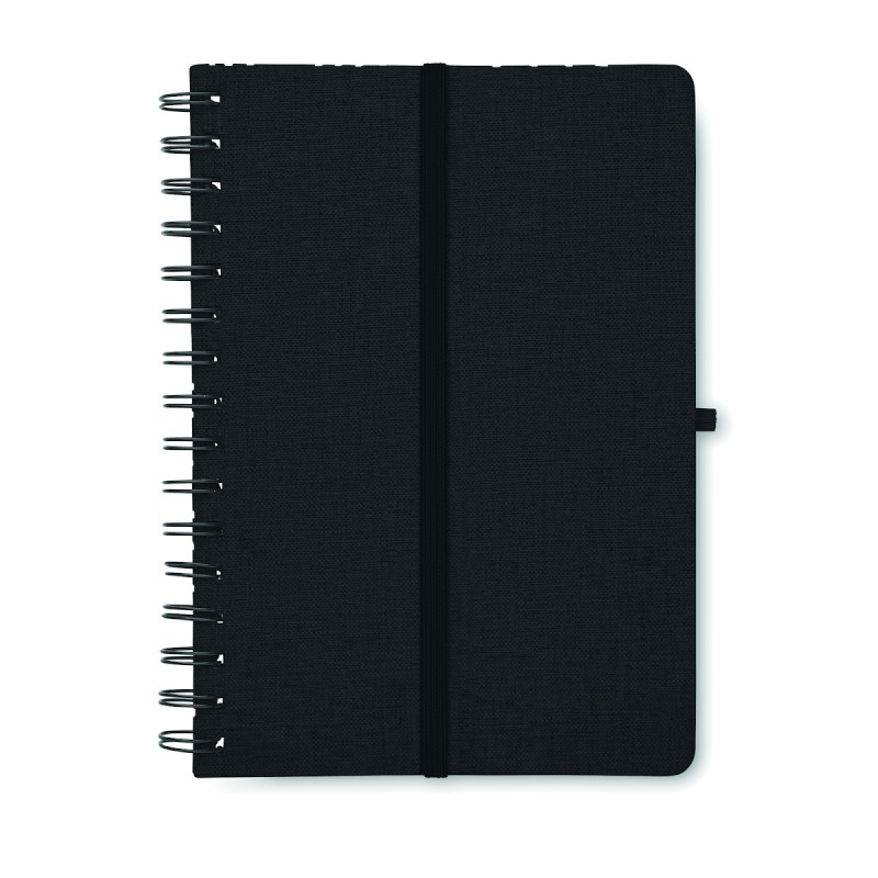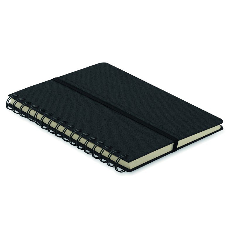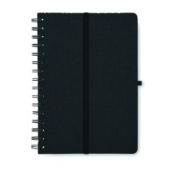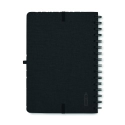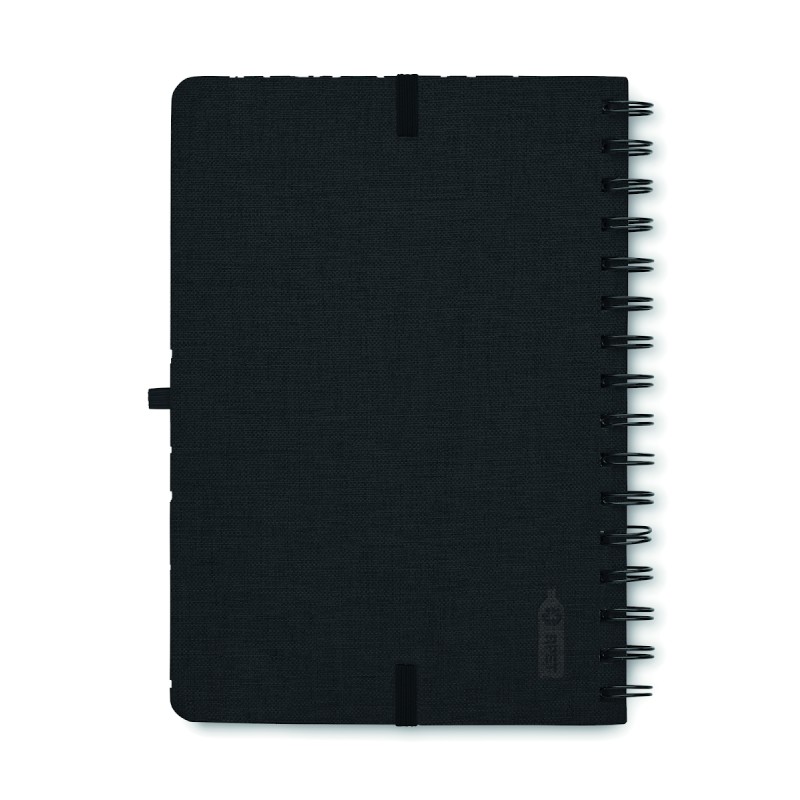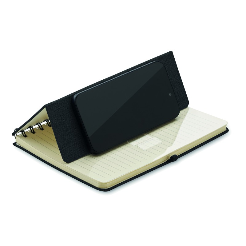 Carnet A5 avec couverture rigide en 600D RPET et fonction de support pour smartphone. Reliure à spirale. 160 pages lignées (80 feuilles). papier recyclé 70 g/m². Fermeture par élastique.