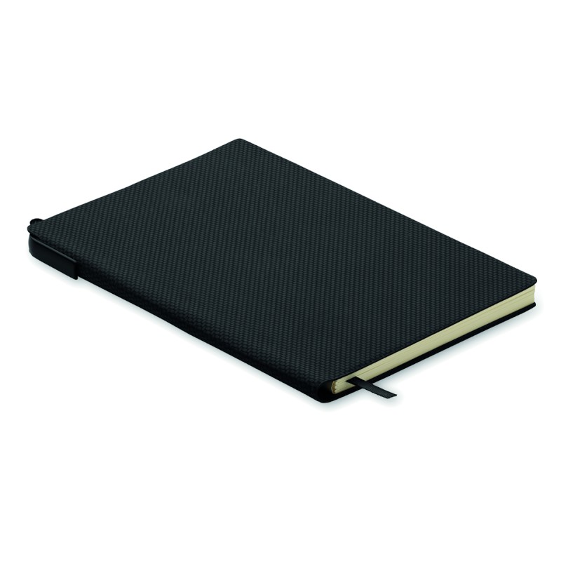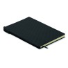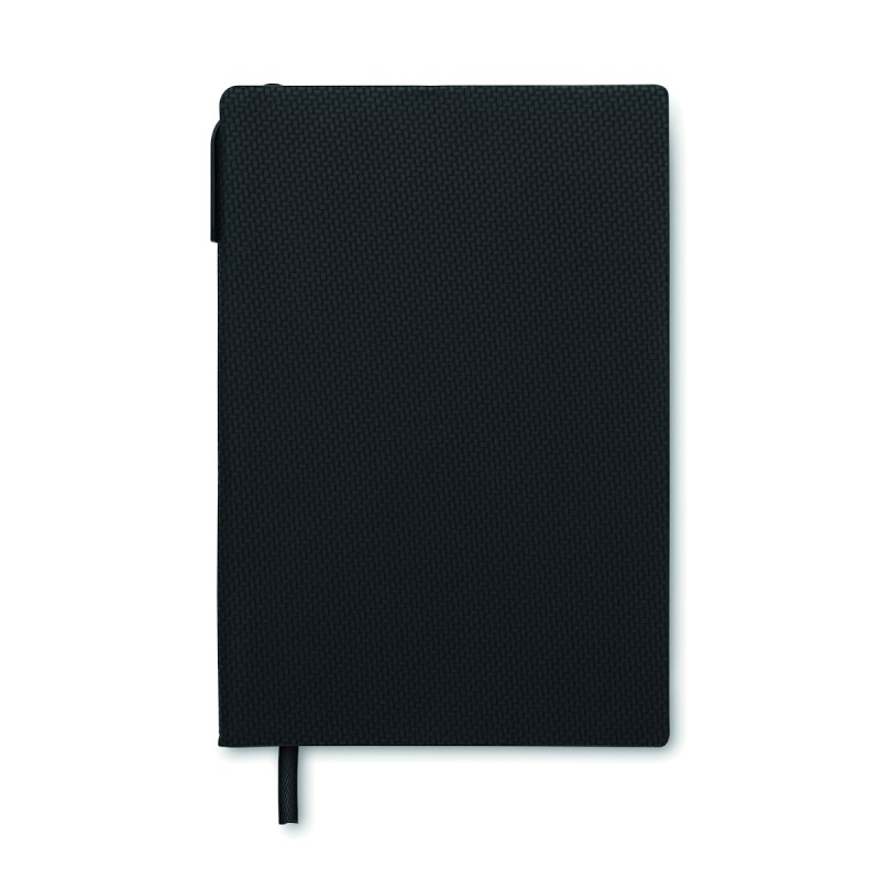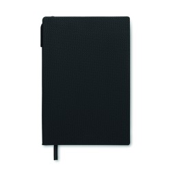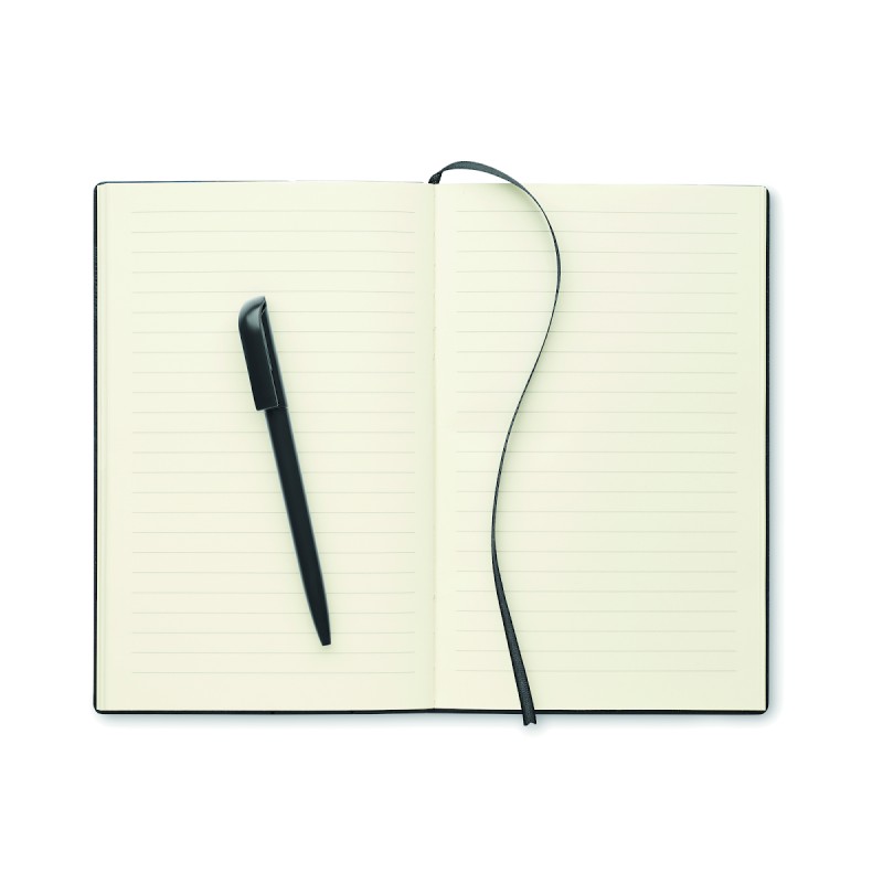 Carnet A5 avec couverture structurée en PU et stylo-bille ABS twist à l'intérieur du porte-stylo du dos. 160 pages lignées en papier recyclé (80 feuilles).