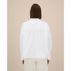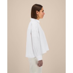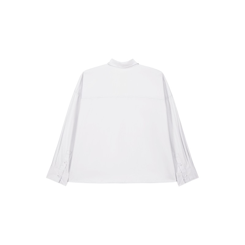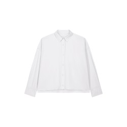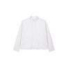 Col chemise avec pied de col Patte de boutonnage à même avec surpiqûre simple de chaque côté Coutures d'épaules avancées avec surpiqûre double Épaules tombantes Empiècement dos avec surpiqûre double Fente de manche avec un bouton Poignets carrés à un bouton Double pli aux poignets Bas de corps arrondi (plus long au dos) avec fentes latérales