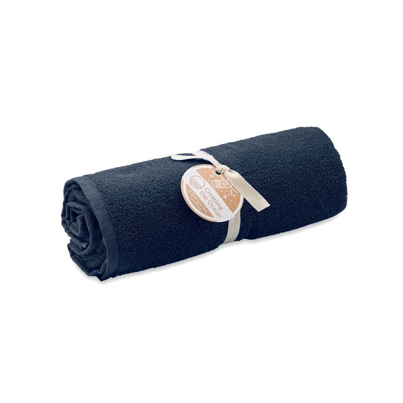 Serviette de bain ou de plage jacquard en tissu recyclé. 70% coton recyclé et 30% polyester recyclé polyester recyclé SEAQUAL® YARN. 500 gr/m². 100x170 cm. SEAQUAL INITIATIVE collabore avec des organismes de nettoyage des océans dans le monde entier afin de valoriser les déchets qu'ils récupèrent. les déchets qu'ils récupèrent. Fabriqué dans l'UE.