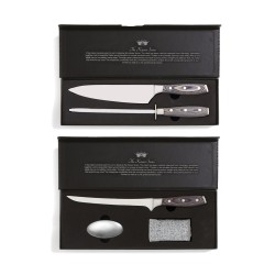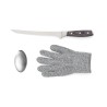 Ensemble de filetage de poisson comprenant un couteau de filetage, un gant en maille d'acier et un savon métallique. Le gant offre une prise supplémentaire sur le poisson tout en vous protégeant de toute mésaventure. Le savon métallique élimine les odeurs de poisson et d'oignon que les autres savons ont du mal à éliminer. Le couteau est fabriqué en acier allemand X50CrMoV15 avec un manche en pakkawood. Le manche facile à saisir et le superbe équilibre de la lame rendent le couteau confortable et facile à utiliser. Taille : Lame de 21 cm.