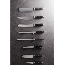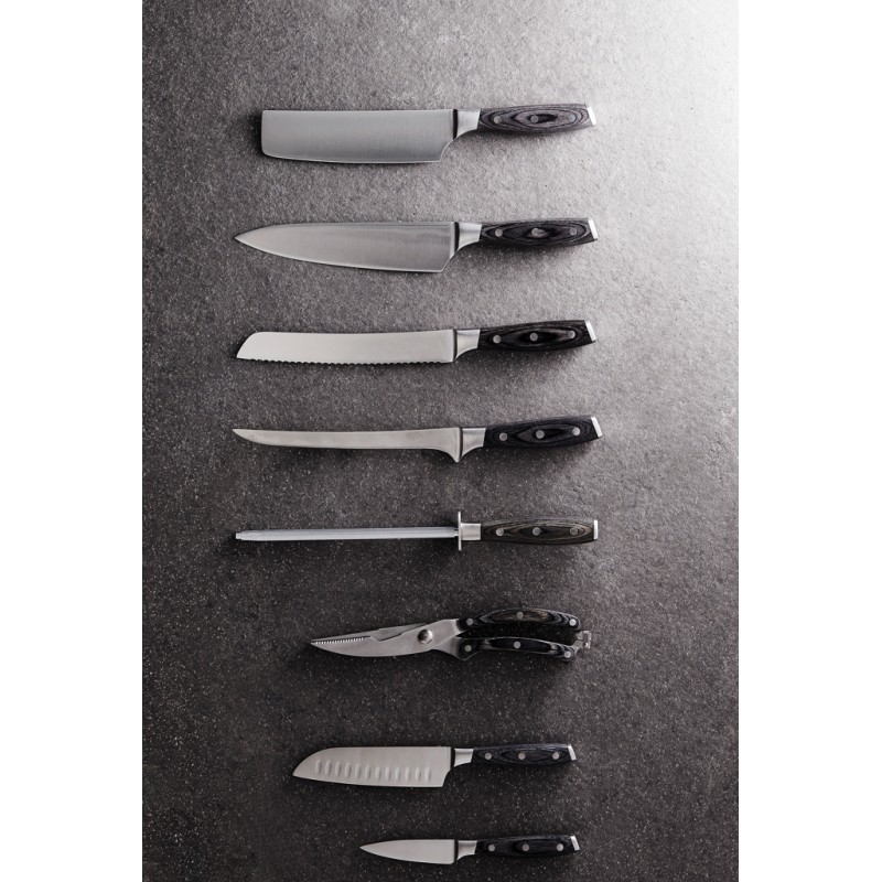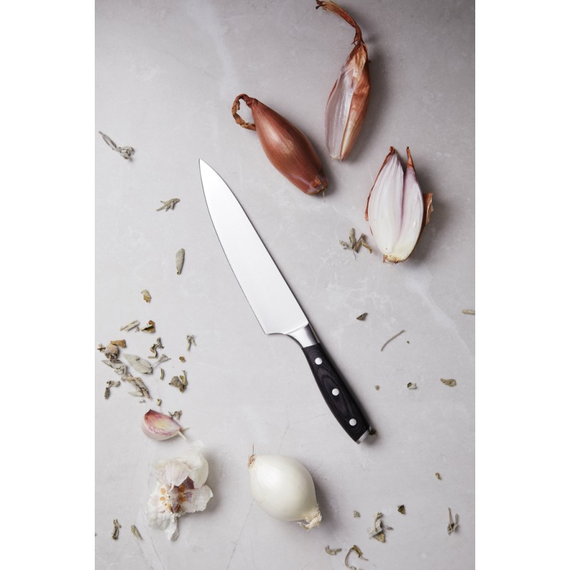 Couteau de chef en acier allemand X50CrMoV15 avec un manche en pakkawood. Le manche facile à saisir et le superbe équilibre de la lame rendent le couteau confortable et facile à utiliser. Taille : Lame de 20 cm.