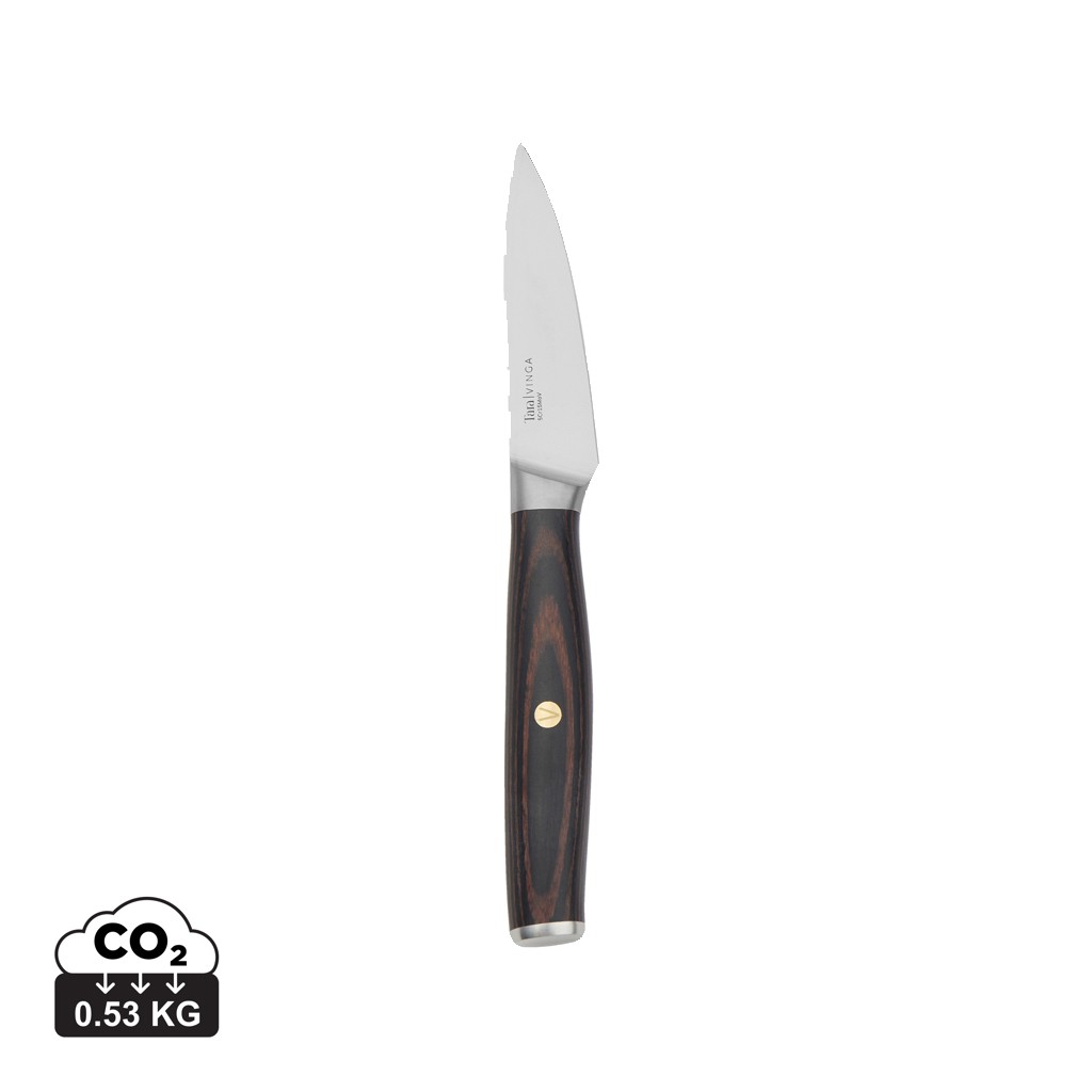 Couteau économe Tara, fabriqué en acier inoxydable recyclé, offre à la fois style et polyvalence. Avec sa lame plus courte mais polyvalente il est idéal pour éplucher les fruits et les légumes, ainsi que pour trancher de petits ingrédients comme l'ail, offrant précision et finesse pour les tâches de cuisine. Fabriqués en acier inoxydable 5Cr15Mov de haute qualité, ces couteaux offrent une durabilité et des performances exceptionnelles. Le magnifique manche en bois de pakka offre une prise en main confortable et sûre. Taille : 19,5 cm (lame 8,5 cm). Lavage à la main uniquement pour garantir une longue durée de vie.