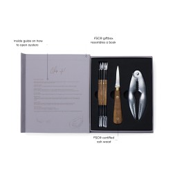 Plongez dans le monde exquis des fruits de mer avec le set Histoire des fruits de mer, élégamment emballé dans un coffret cadeau FSC® qui ressemble à un livre classique. Ce set soigneusement sélectionné comprend un couteau à huîtres, une pince à crabes et quatre fourchettes à fruits de mer, tous fabriqués avec précision en acier inoxydable et en bois de frêne certifié FSC®. L'emballage unique protège non seulement vos outils, mais raconte également une histoire captivante sur les fruits de mer, ce qui en fait un cadeau idéal pour tout amateur de fruits de mer.