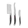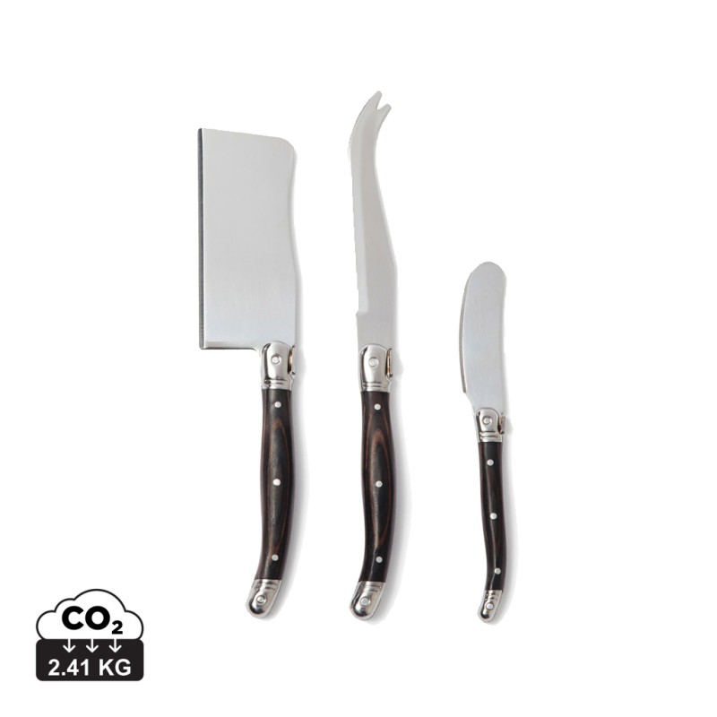 Ensemble exclusif de couteaux à fromage en acier inoxydable, composé de deux couteaux à fromage et d'un couteau à beurre avec un manche en pakkawood noir. Emballé dans une boîte cadeau exclusive.