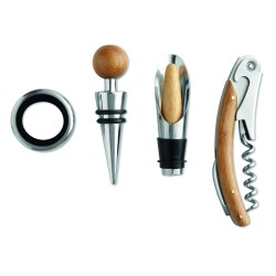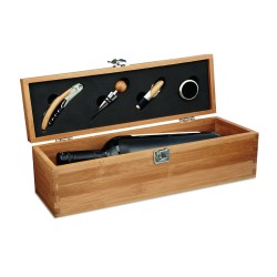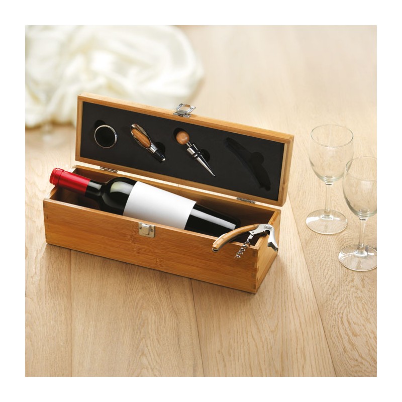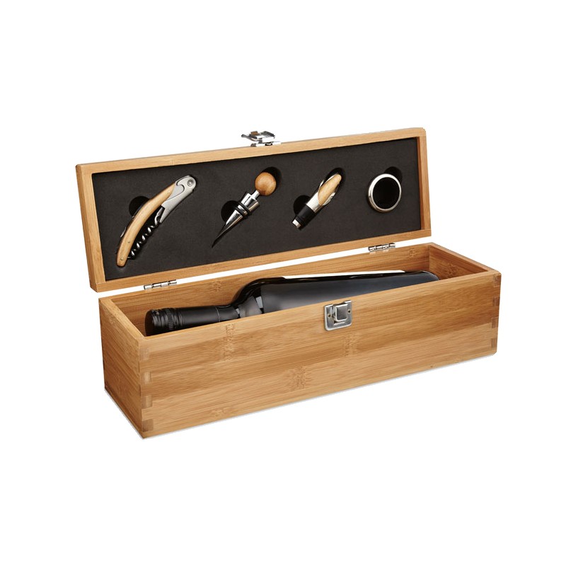 Boite cadeau en bambou prévue pour accueillir une bouteille de vin et accessoires (collier, verseur, bouchon et tire-bouchon). Bouteille de vin non incluse. Le bambou est un produit naturel, et présente de légères variations de couleur, de décoration et de tailles.