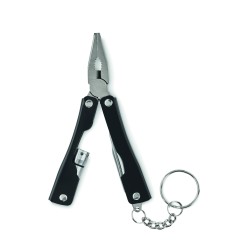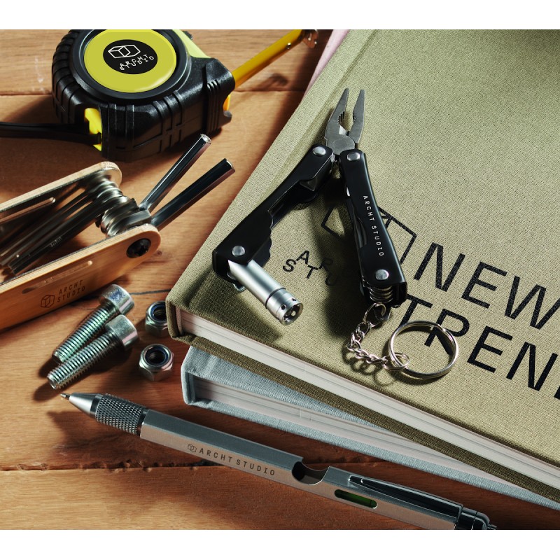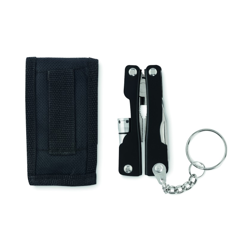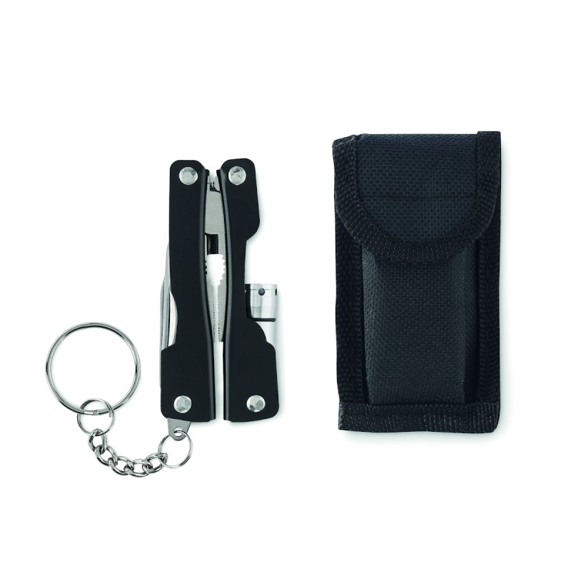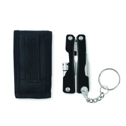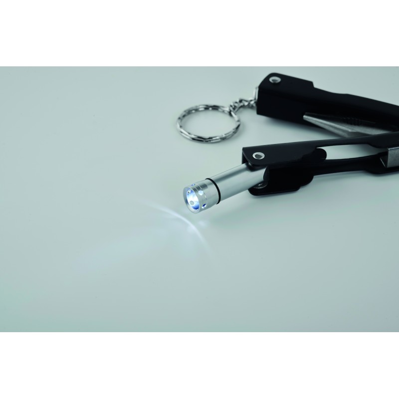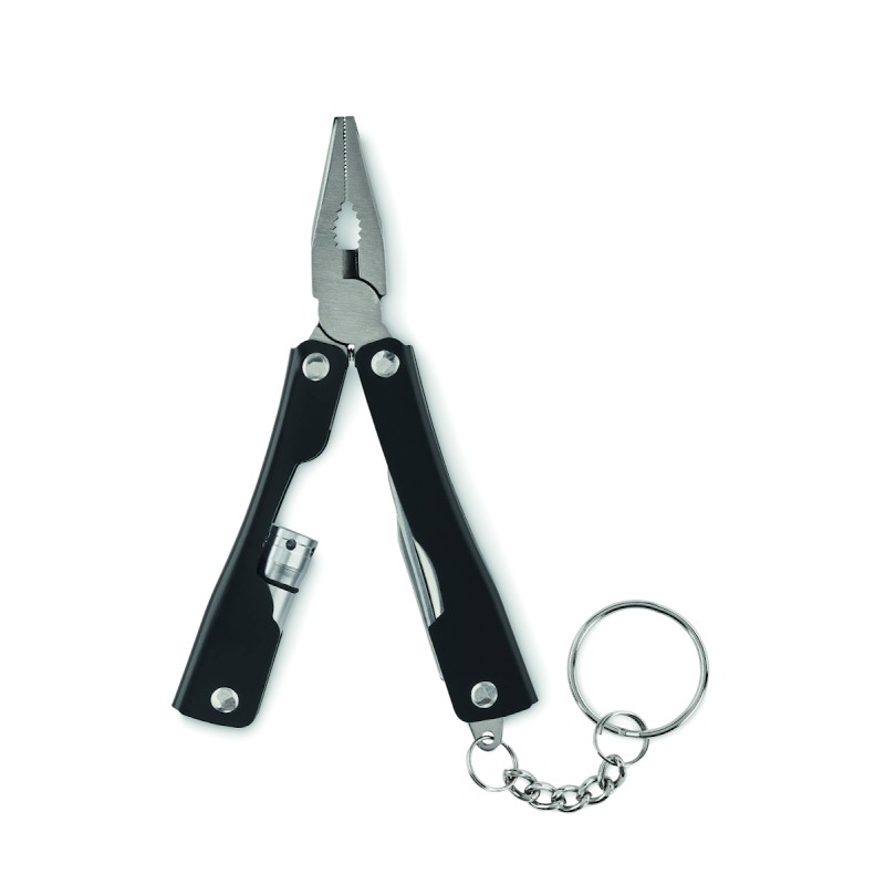 Couteau multi-outils pliable avec lampe de poche en acier inoxydable. Comprend 10 fonctions d'outils et une pochette en polyester 600D. 3 piles bouton AG3 incluses.