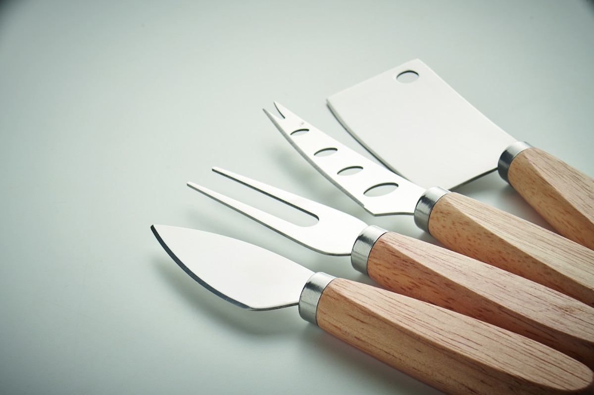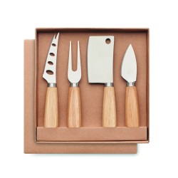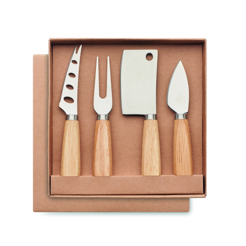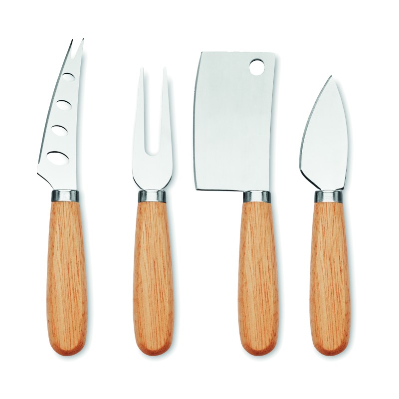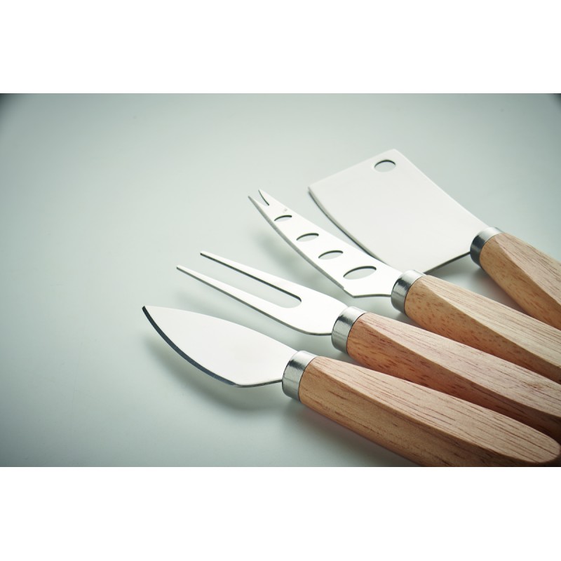 Set de 3 couteaux à fromage de service et 1 fourchette en acier inoxydable avec manche en hévéa.