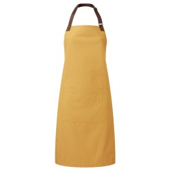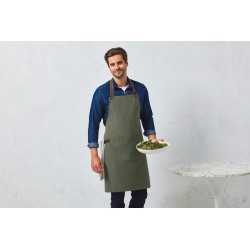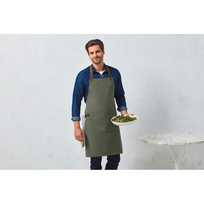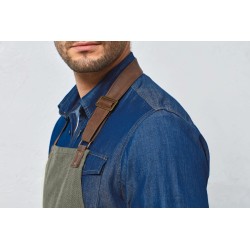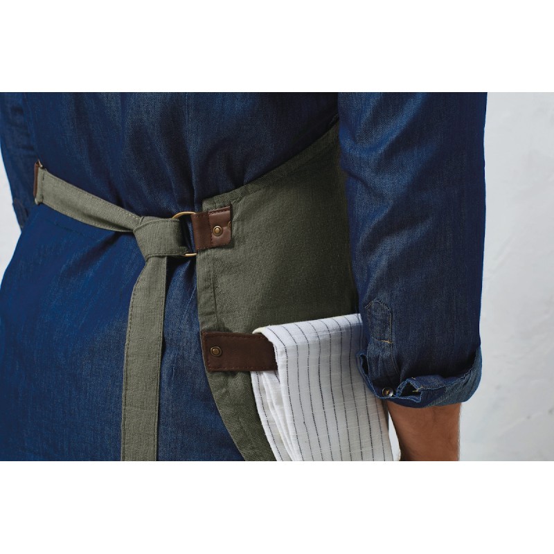 Tablier bavette en fils de coton teints qui sont tissés ensemble pour créer un joli effet contrasté. Poche centrale adaptée pour tablette avec emplacement stylo. Lien dans la continuité du tissu qui s'attache à la taille au moyen d’un anneau en forme de D. Les aspects de simili cuir décoratifs mais pratiques apportent une touche finale splendide à ce magnifique tablier.