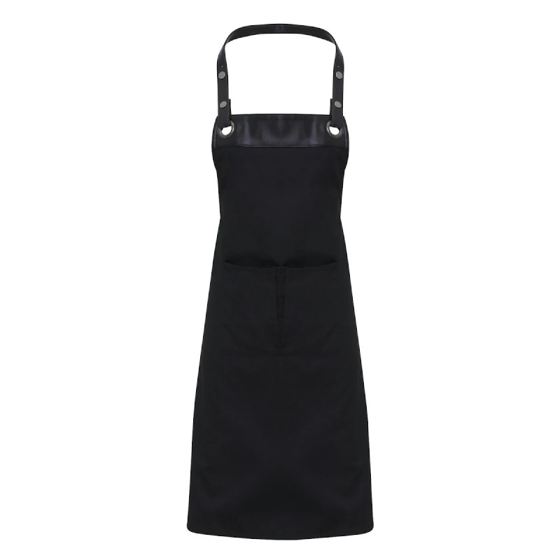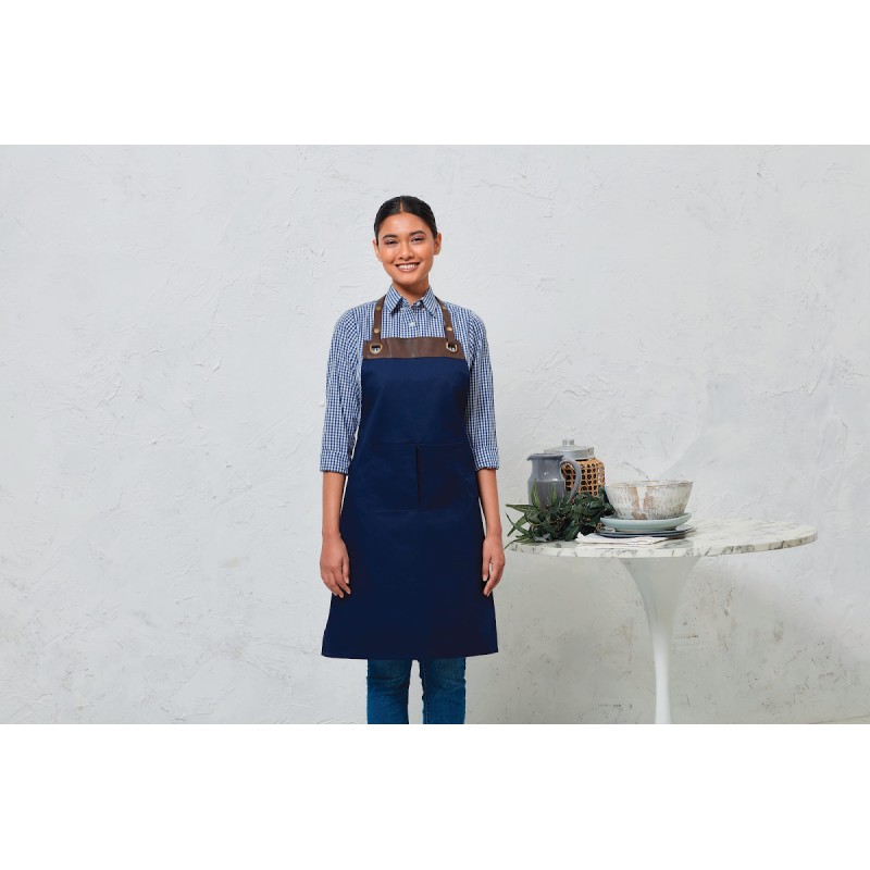 65% polyester / 35% coton. Haut du tablier orné d'une bordure en simili-cuir avec 2 grands œillets dans lesquels passe le tour de cou. Le tour de cou est réglable de chaque côté à l'aide de deux boutons-pression. Poche centrale cousue au milieu pour créer 2 poches.