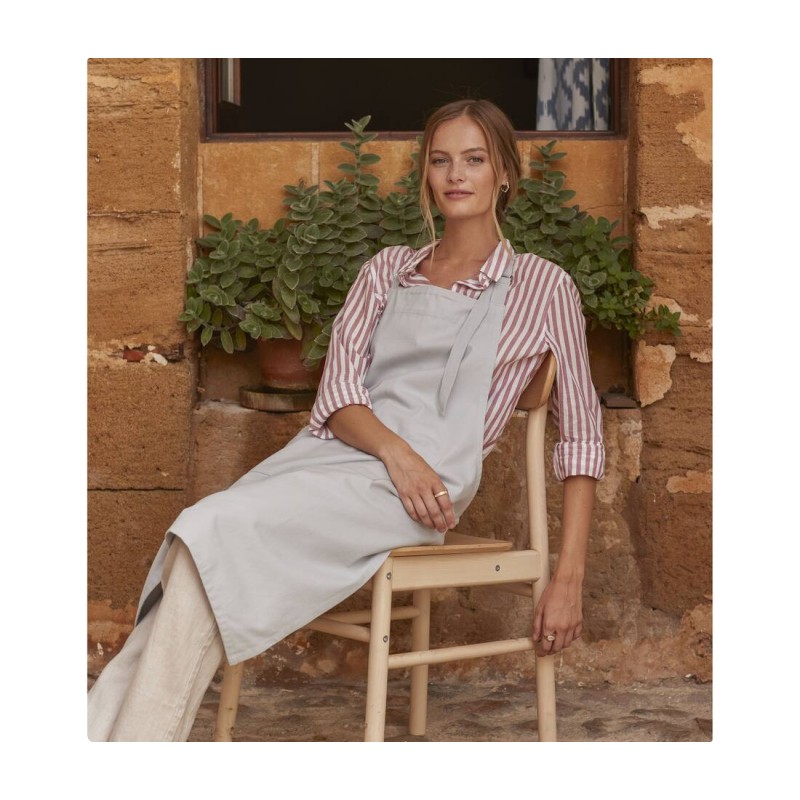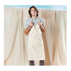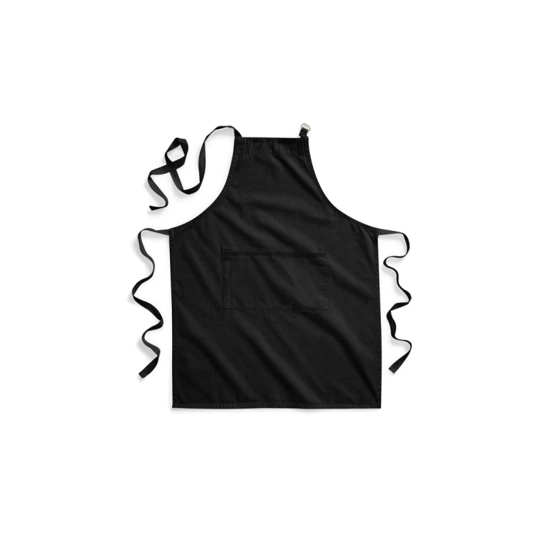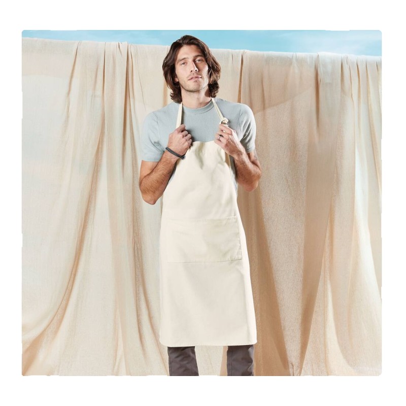 Tablier certifié Fairtrade. Fermeture au cou par boucle. Poche centrale. Surface d'impression 32x38cm.