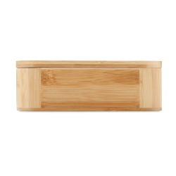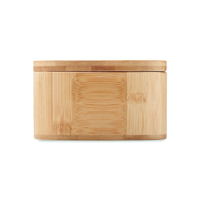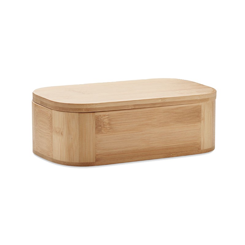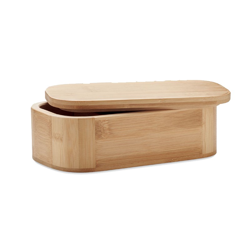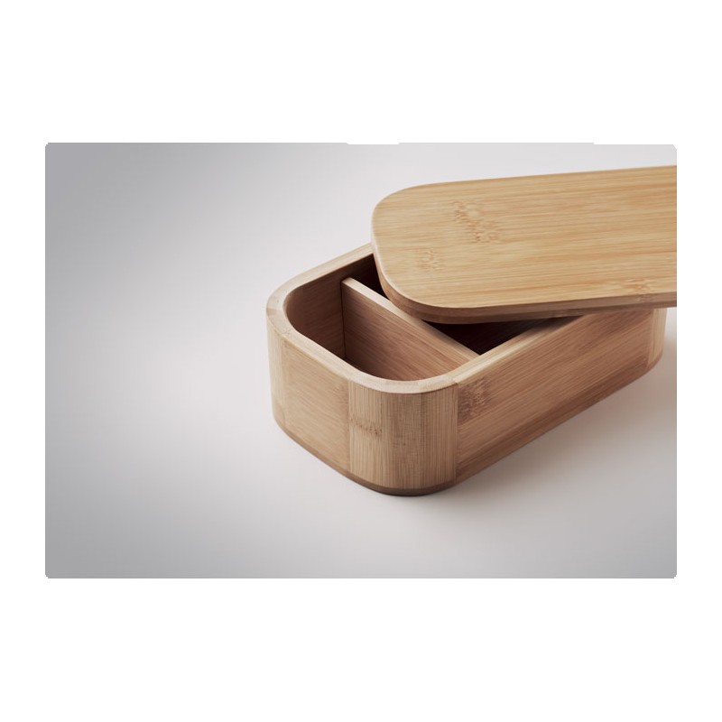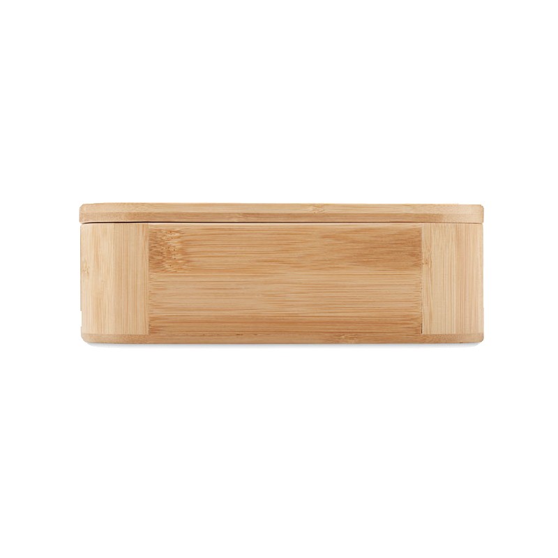 Lunch box en bambou avec séparateur amovible et sangle élastique en nylon. Ne peut contenir que des aliments secs. Capacité : 1L. Le bambou est un produit naturel, et présente de légères variations de couleur, de décoration et de tailles.