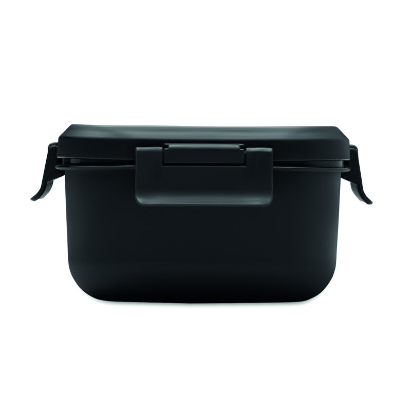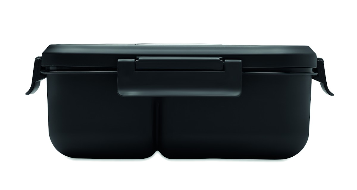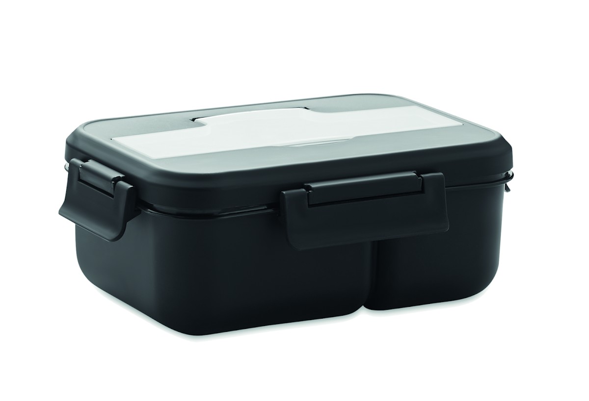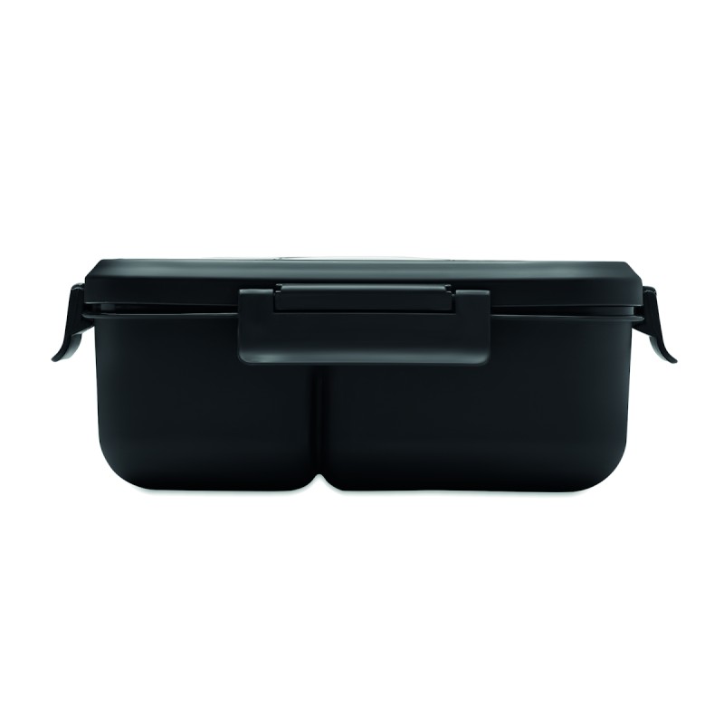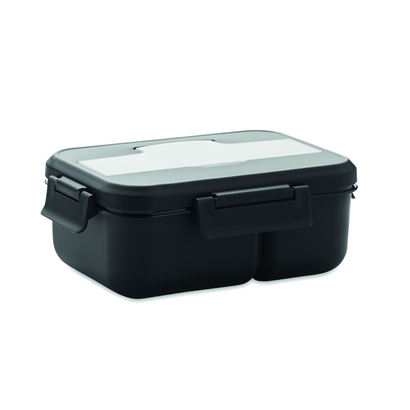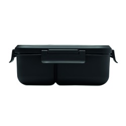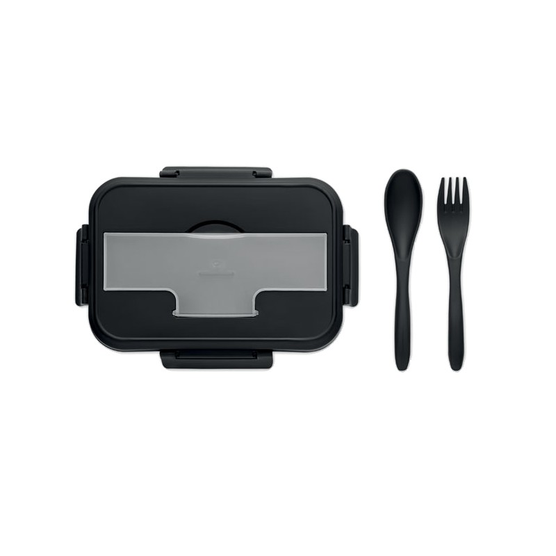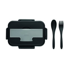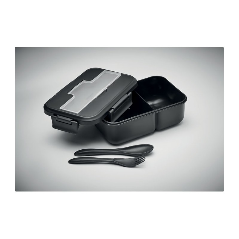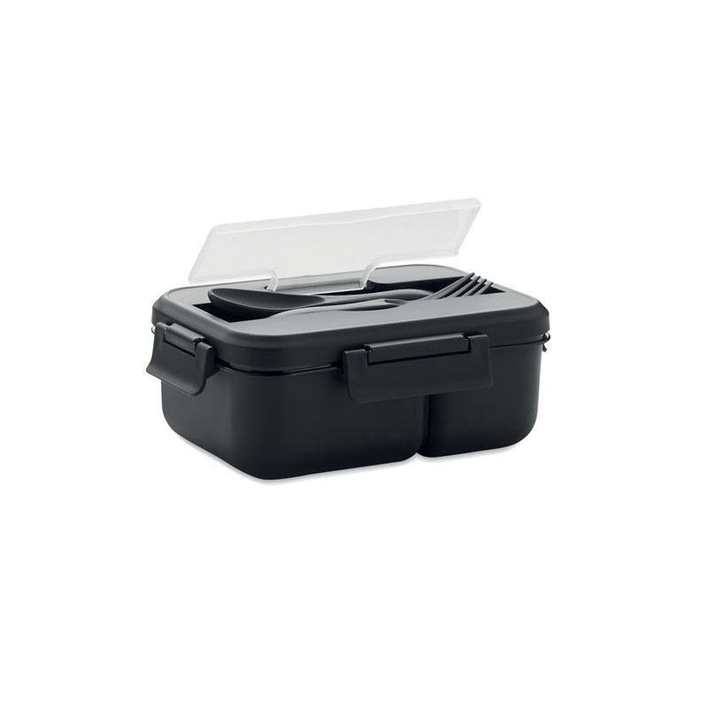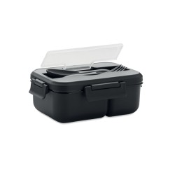 Boîte à lunch à deux niveaux en PP avec un set de couverts assorti et une poignée. Capacité totale : 1000 ml