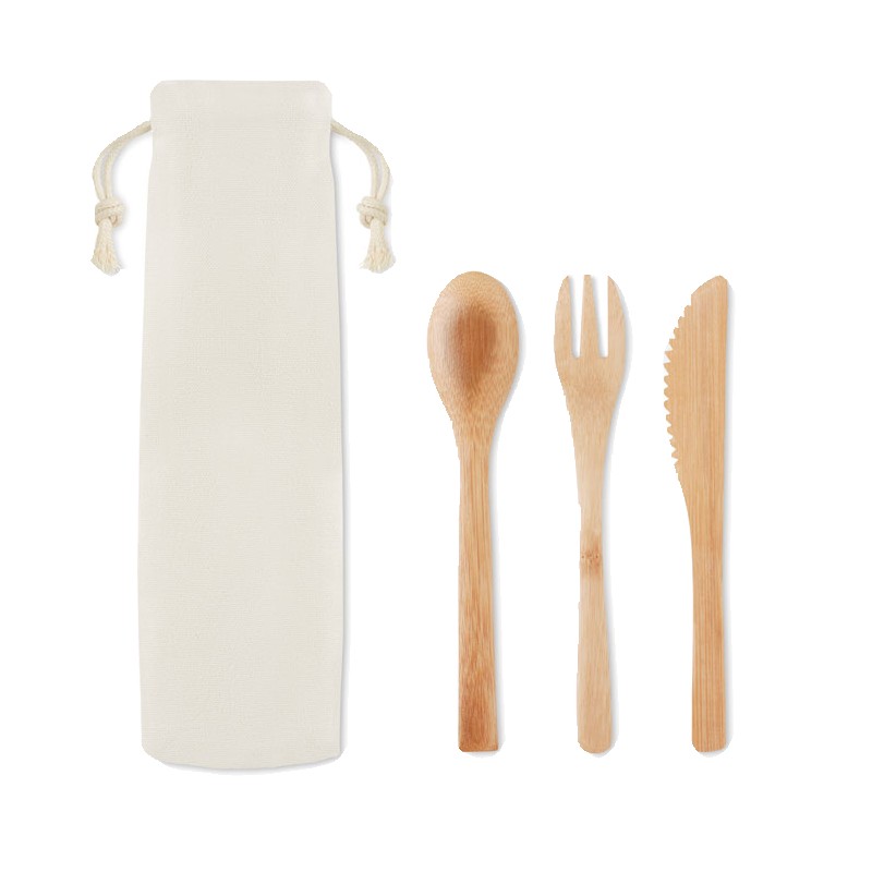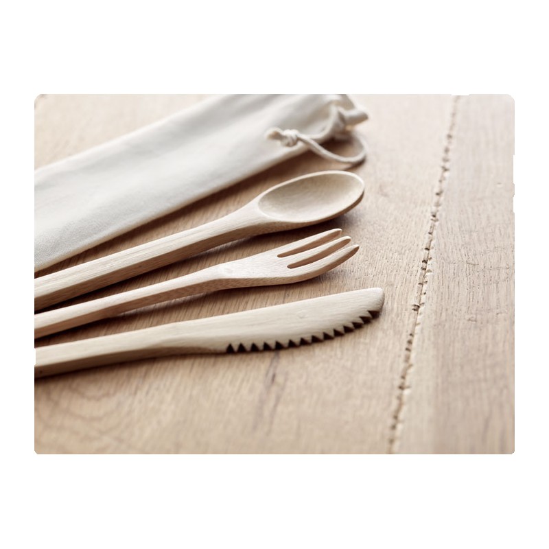 Couverts en bambou réutilisables dans une pochette en toile. Comprend un couteau, une fourchette et une cuillère. Le bambou est un produit naturel, et présente de légères variations de couleur, de décoration et de tailles.