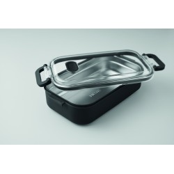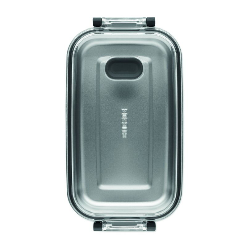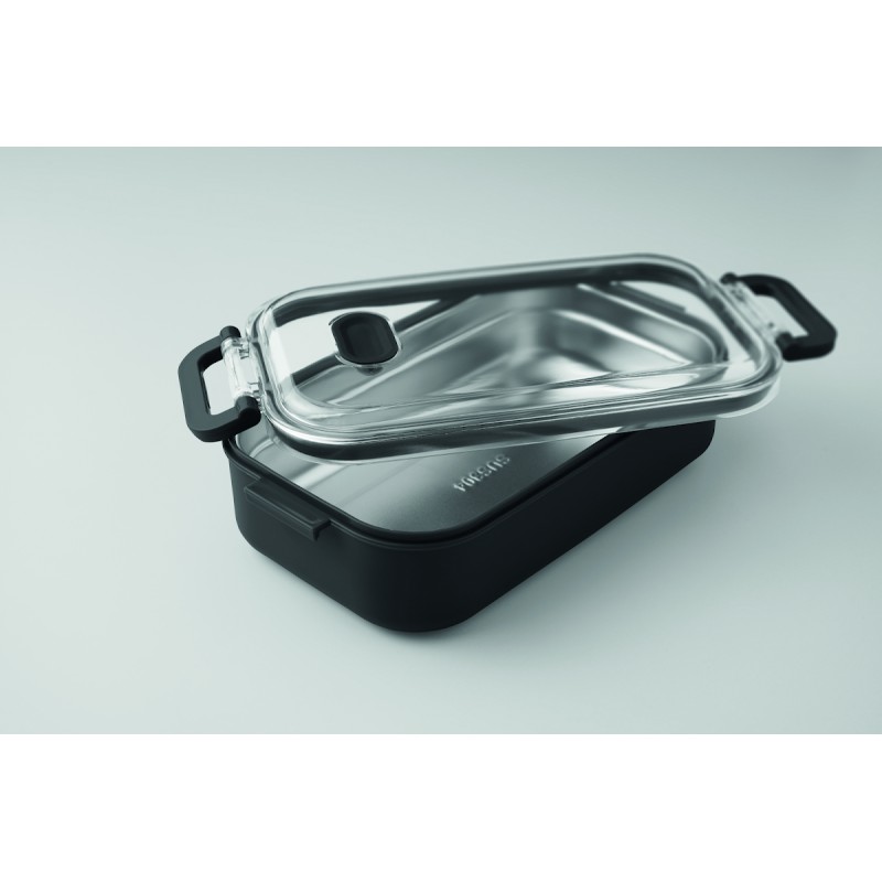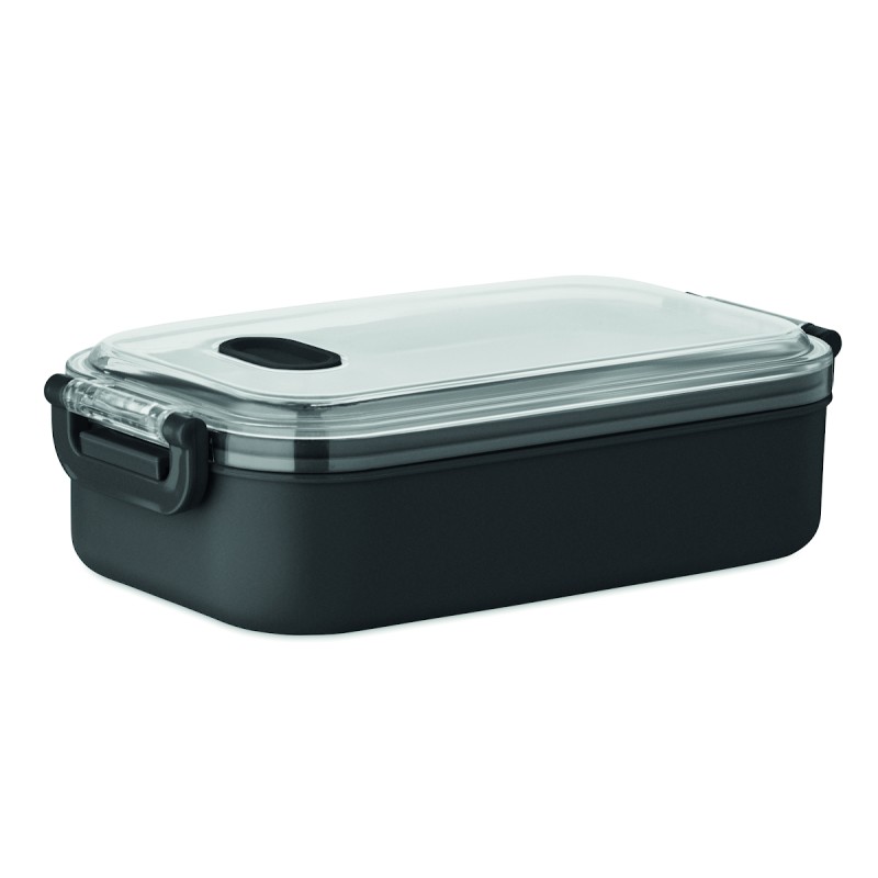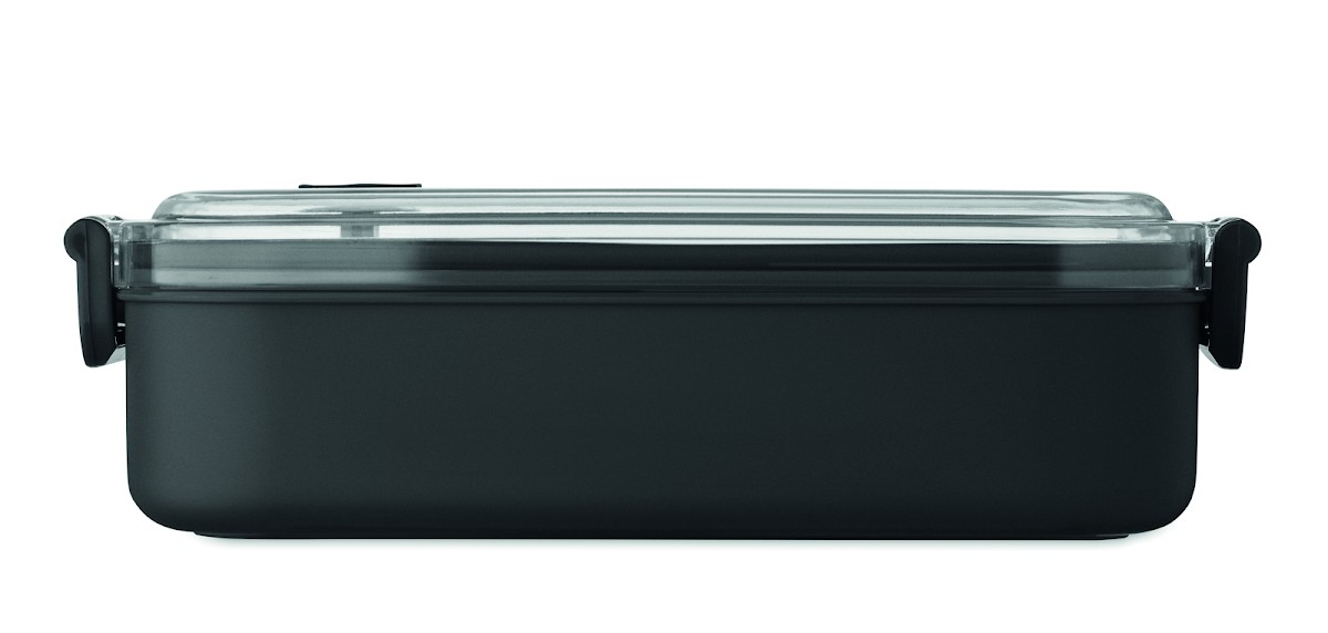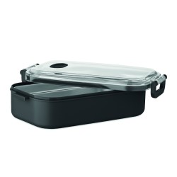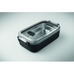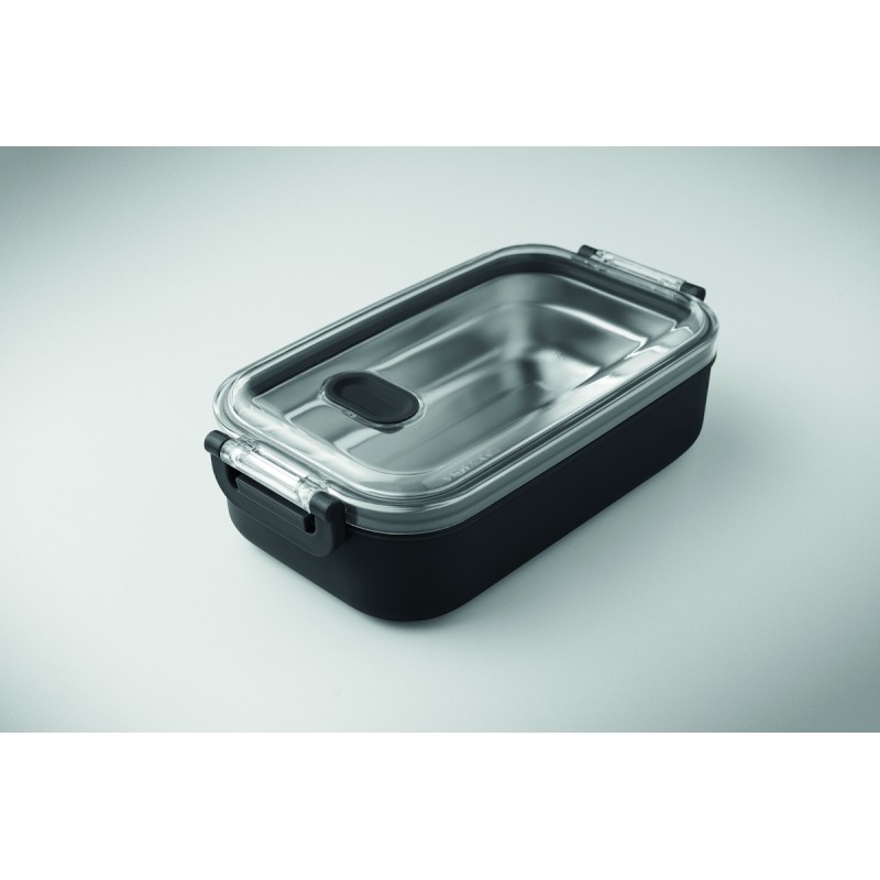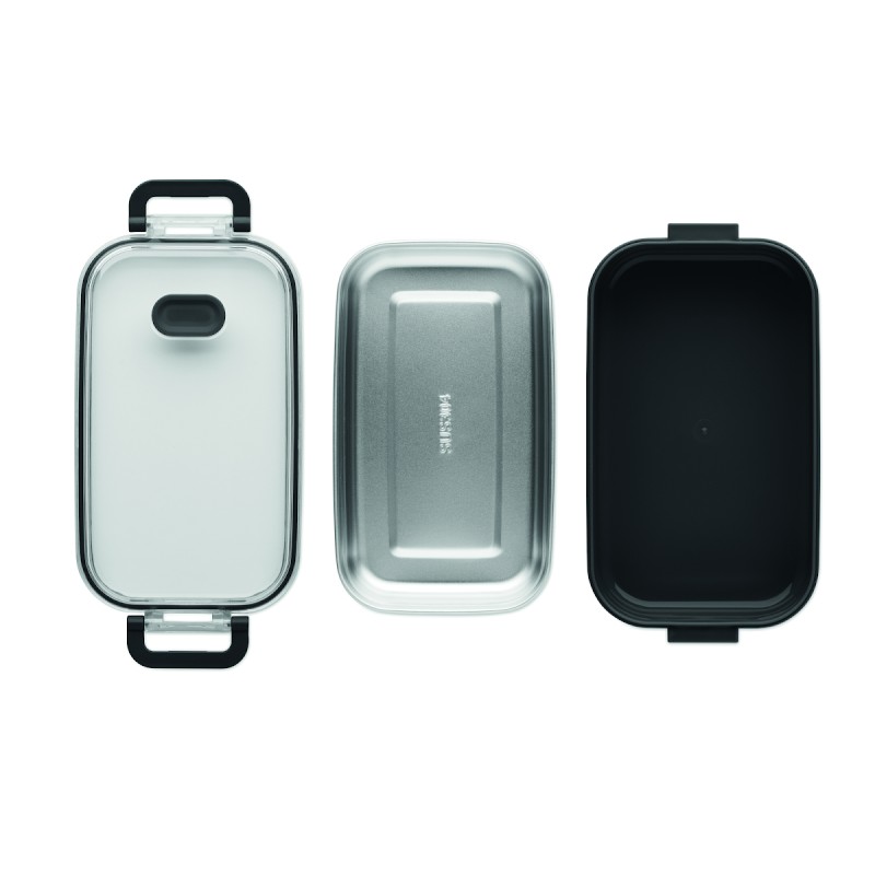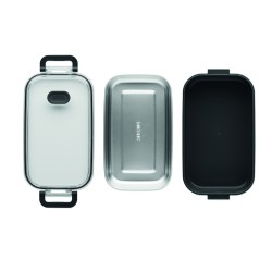 Boîte à lunch en PP avec intérieur en acier inox recyclé. Couvercle AS étanche qui garde les aliments frais et sécurisés pendant le transport. Capacité de 750 ml sans plateau et de 650 ml avec.