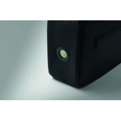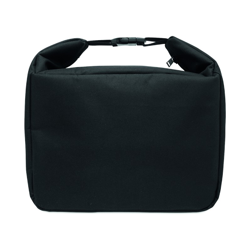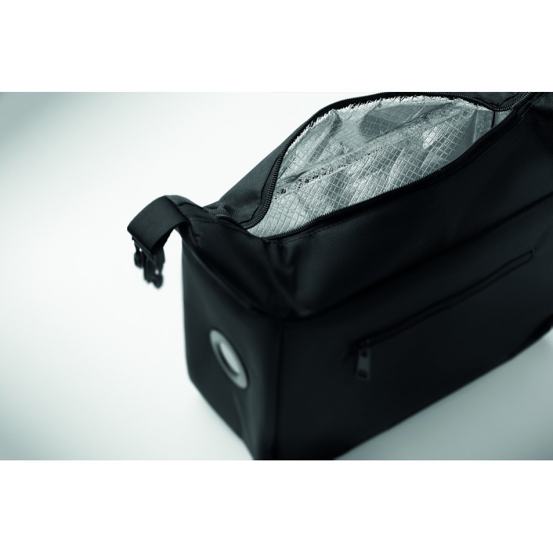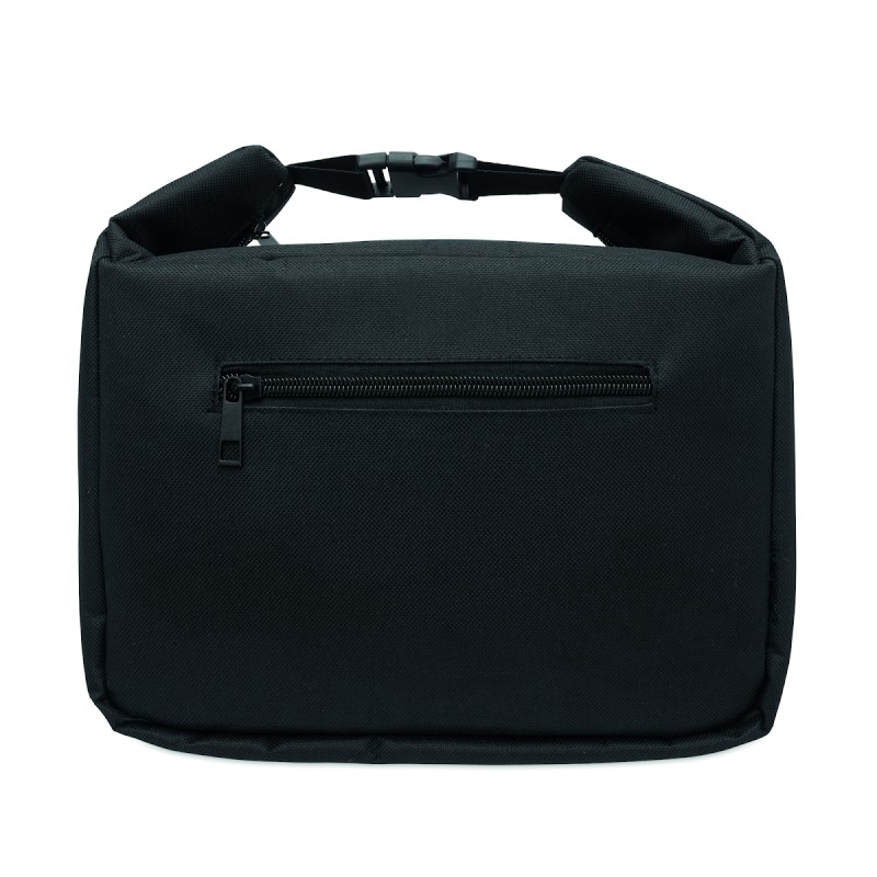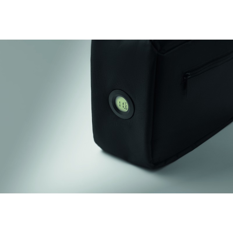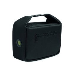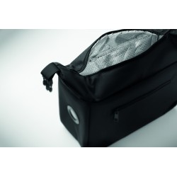 Sac isotherme avec indicateur de température intérieure en 600D RPET avec mousse PE de 3mm et doublure en aluminium. Compartiment principal zippé . Avec poche latérale zippée. Capacité : 5 L
