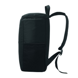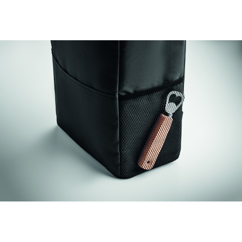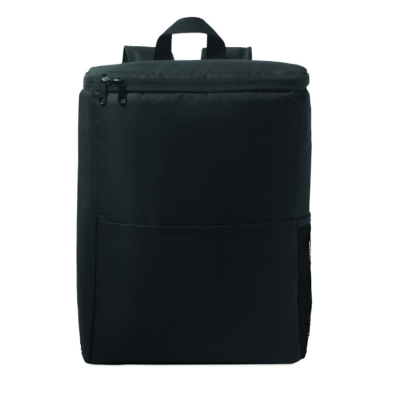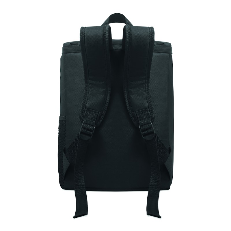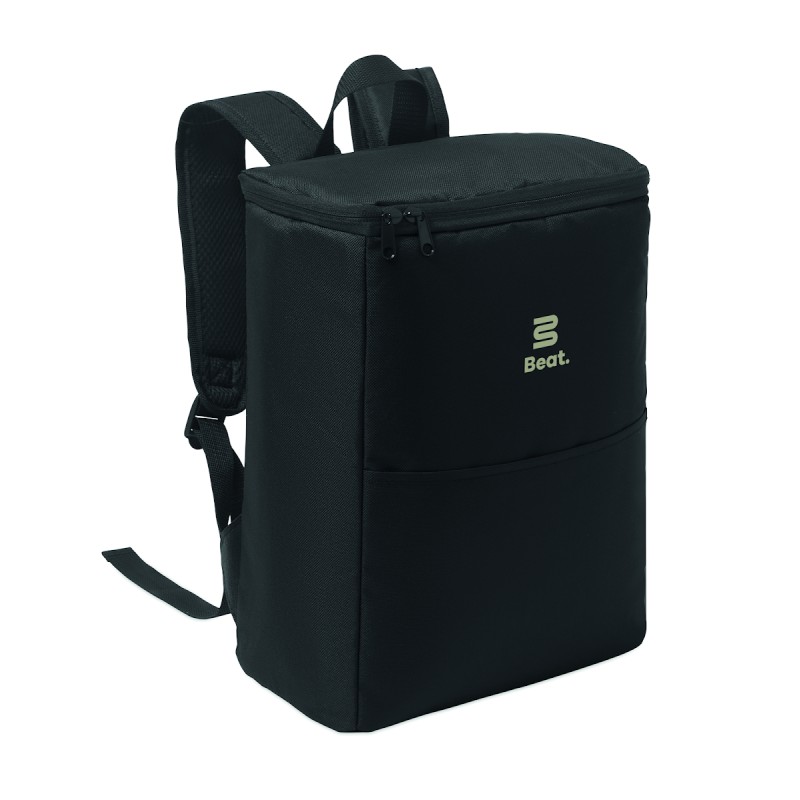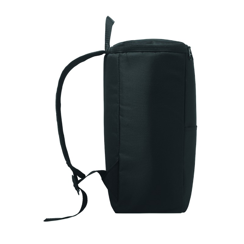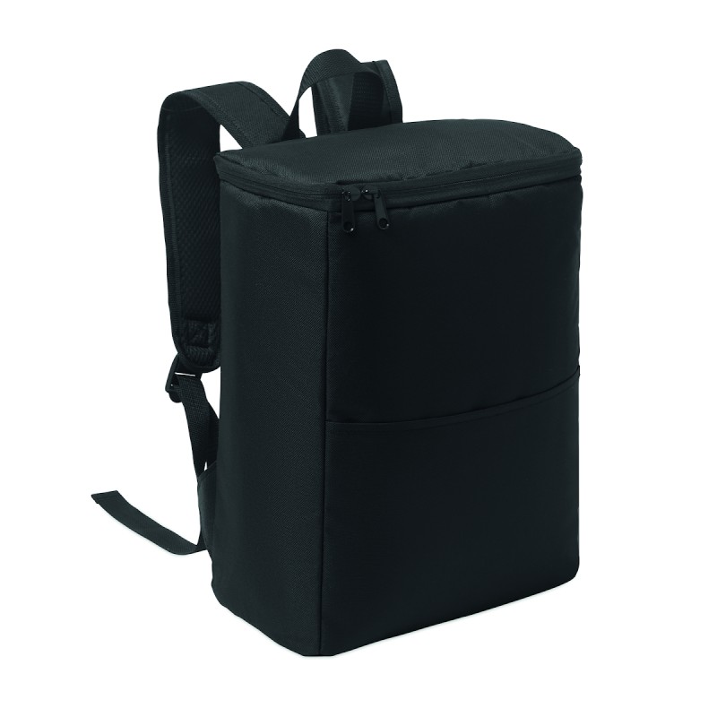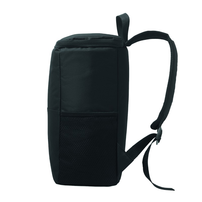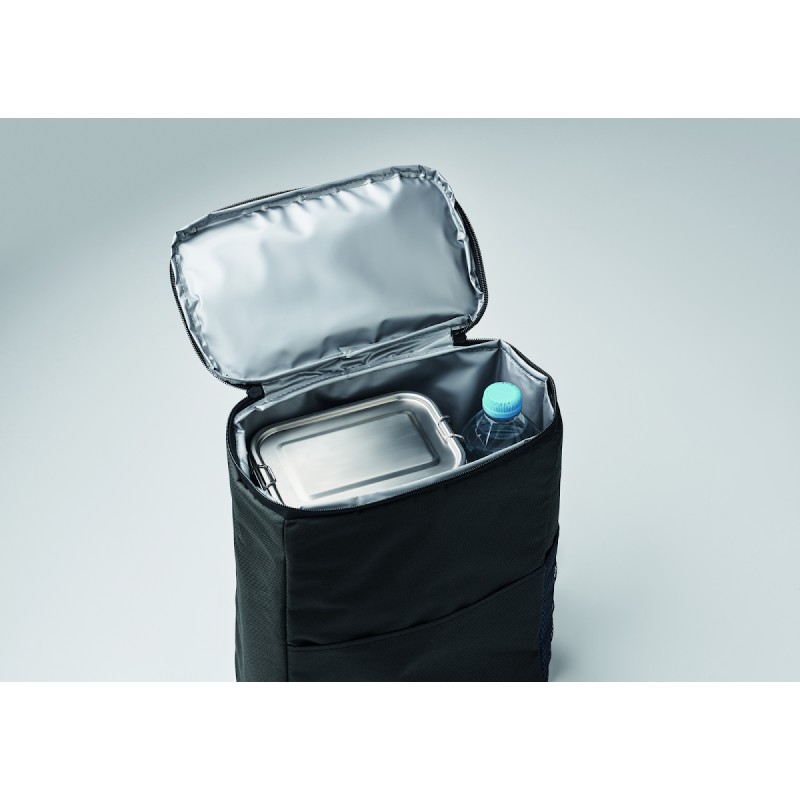 Sac à dos isotherme en polyester 600D RPET avec bandoulière réglable rembourrée, 1 poche latérale zippée en filet et 1 poche frontale. Doublure en PEVA avec mousse PE de 13 mm. Capacité 11L.