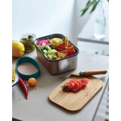 Suite au succès de notre première boîte à sandwich, nous avons introduit cette version plus grande pour vous permettre d'emporter des articles plus volumineux tels que des fruits et des yaourts. Il s'agit d'une solution robuste, 100% sans plastique, pour préparer et transporter vos sandwichs, votre charcuterie ou même votre sélection de fromages ! La boîte à sandwich en acier inoxydable fait partie de ces produits qui vous semblent familiers et fiables dès le premier jour, et qui sont conçus pour vieillir en beauté. Utilisez le couvercle en bambou naturellement antibactérien comme planche à découper pour créer vos sandwichs ou comme planche de service pour assembler les ingrédients d'un délicieux repas plus tard dans la journée. La boîte en acier inoxydable protège le contenu et la sangle en silicone offre une sécurité supplémentaire. Le compartiment intérieur permet de séparer les différents aliments et passe au four à micro-ondes. Lavage à la main uniquement.