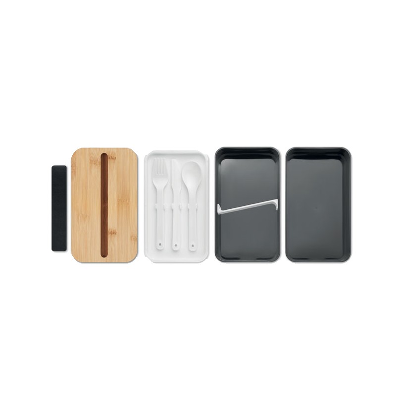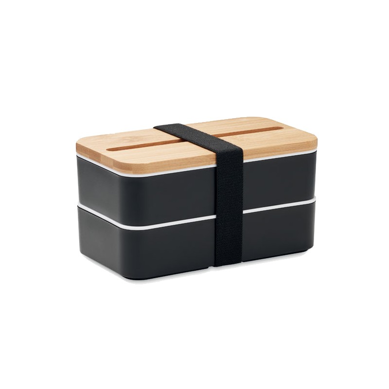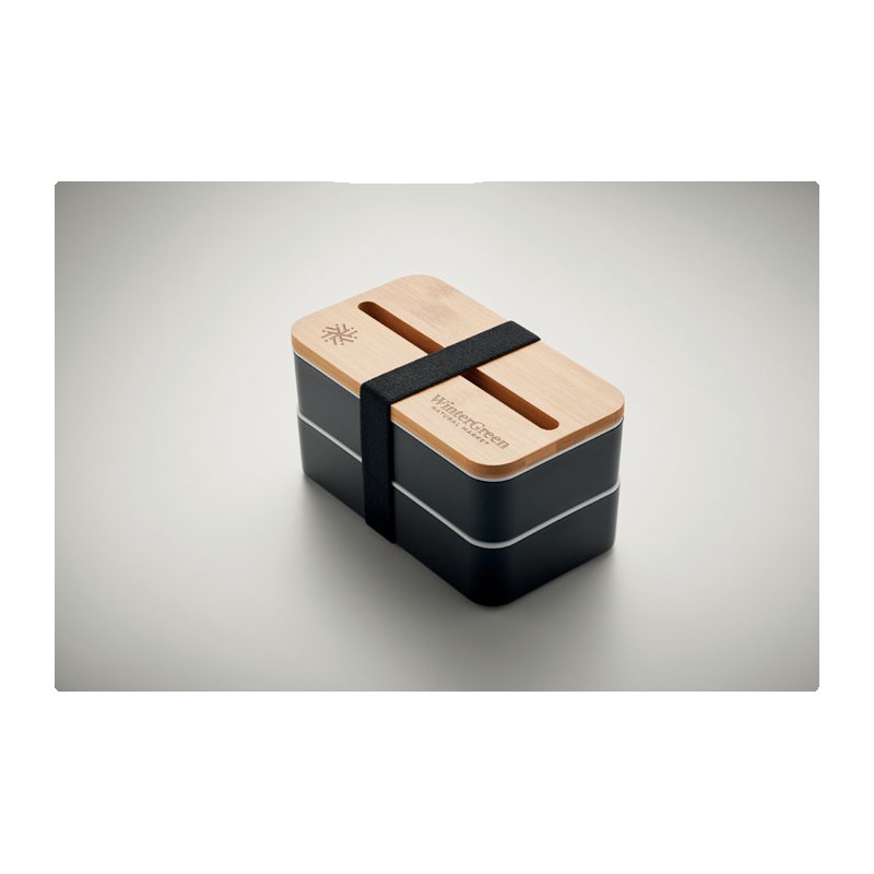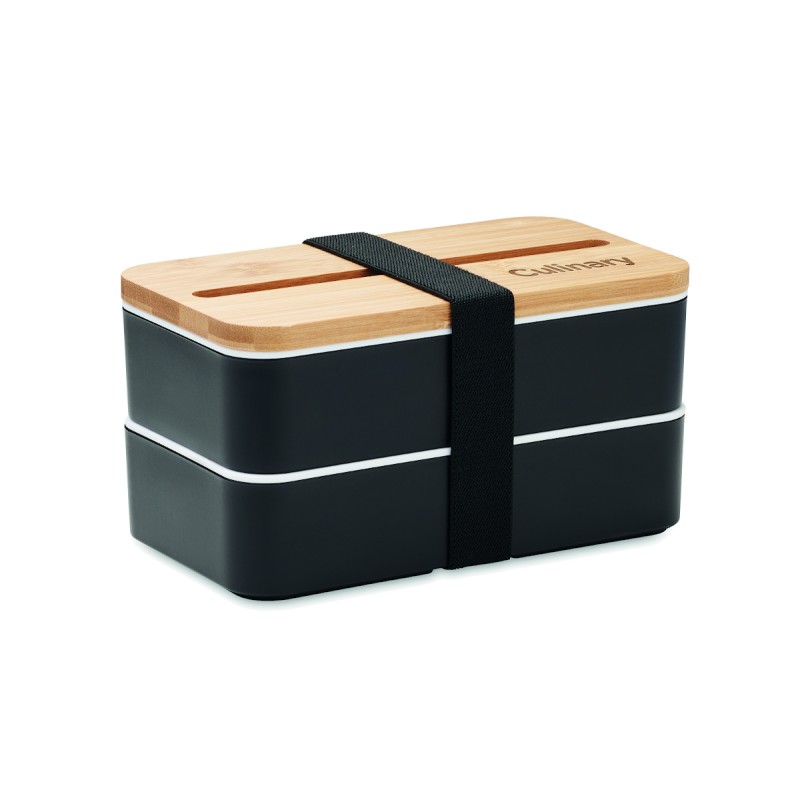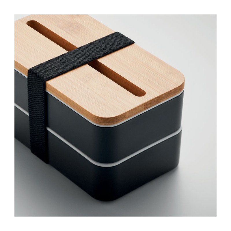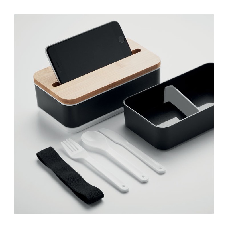 Lunchbox à deux niveaux en PP avec séparateur amovible et 3 couverts. Bande de fermeture en polyester et couvercle en bambou doté d'un support pour téléphone portable. Capacité : 400 ml (2x). Le bambou est un produit naturel, et présente de légères variations de couleur, de décoration et de tailles.