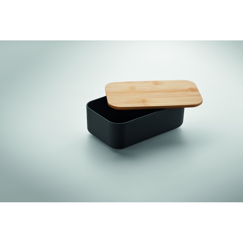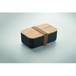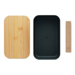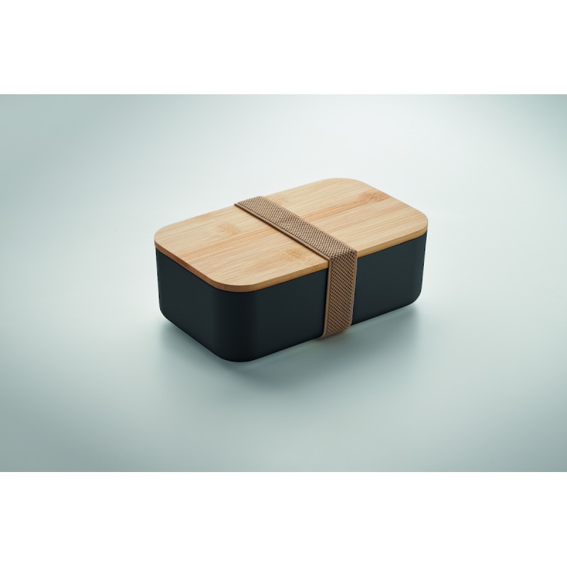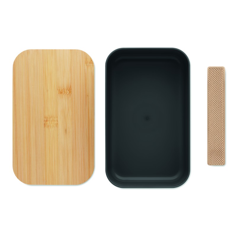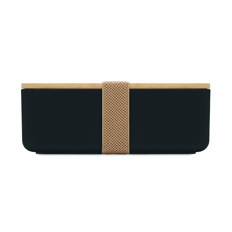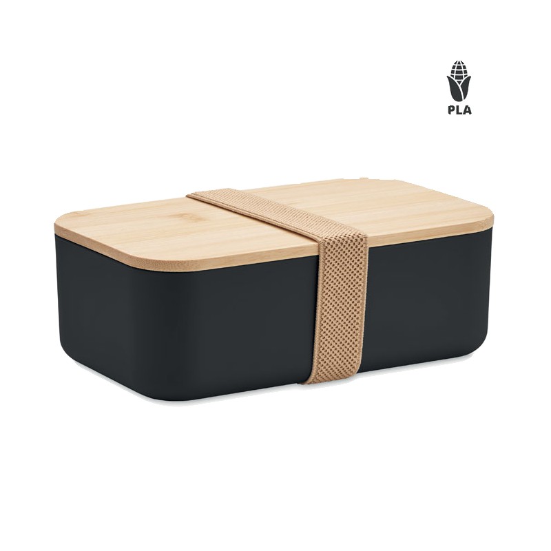 Boîte à lunch en maïs 100% PLA avec couvercle en bambou et fermeture élastique en RPET. Capacité : 1000 ml.