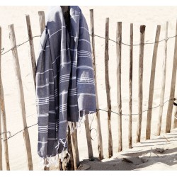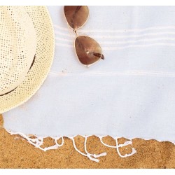 Fouta rayé avec franges. Matière légère et séchage rapide. Lavable jusqu'à 30°.