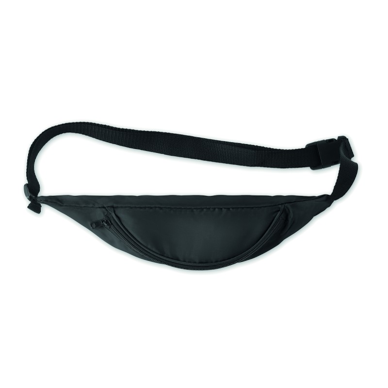 Sac banane en polyester 210D avec compartiment principal zippé et sangle ajustable à la taille.