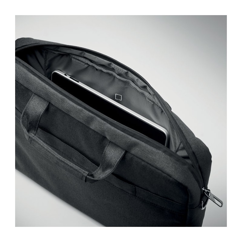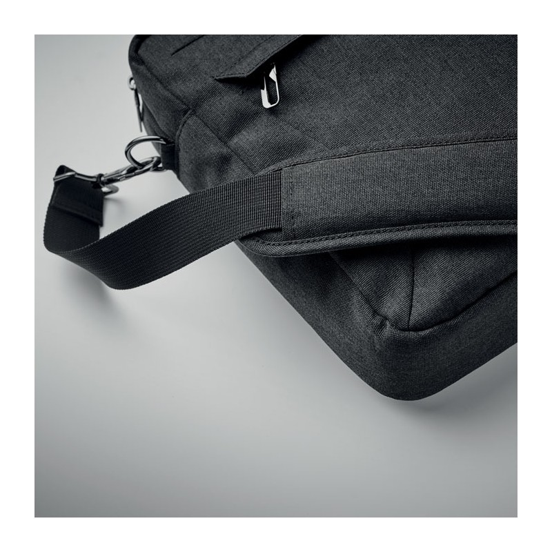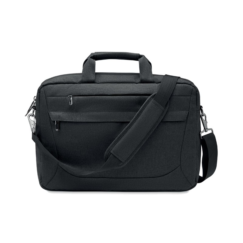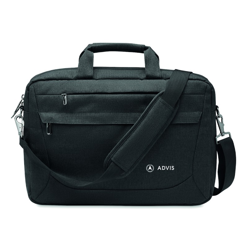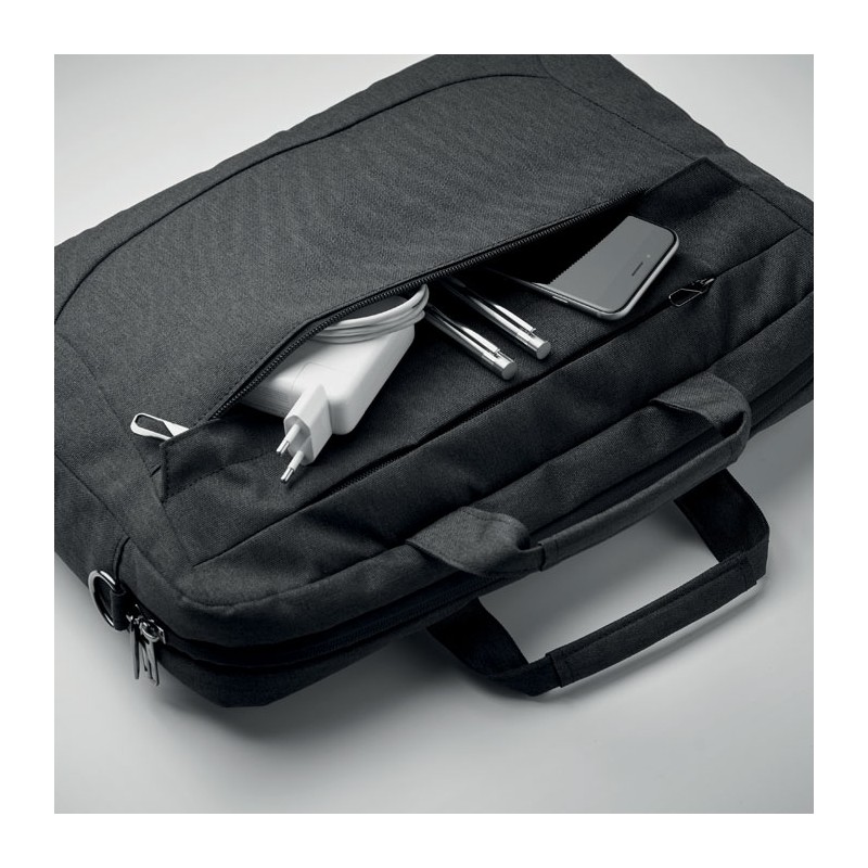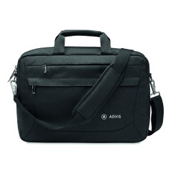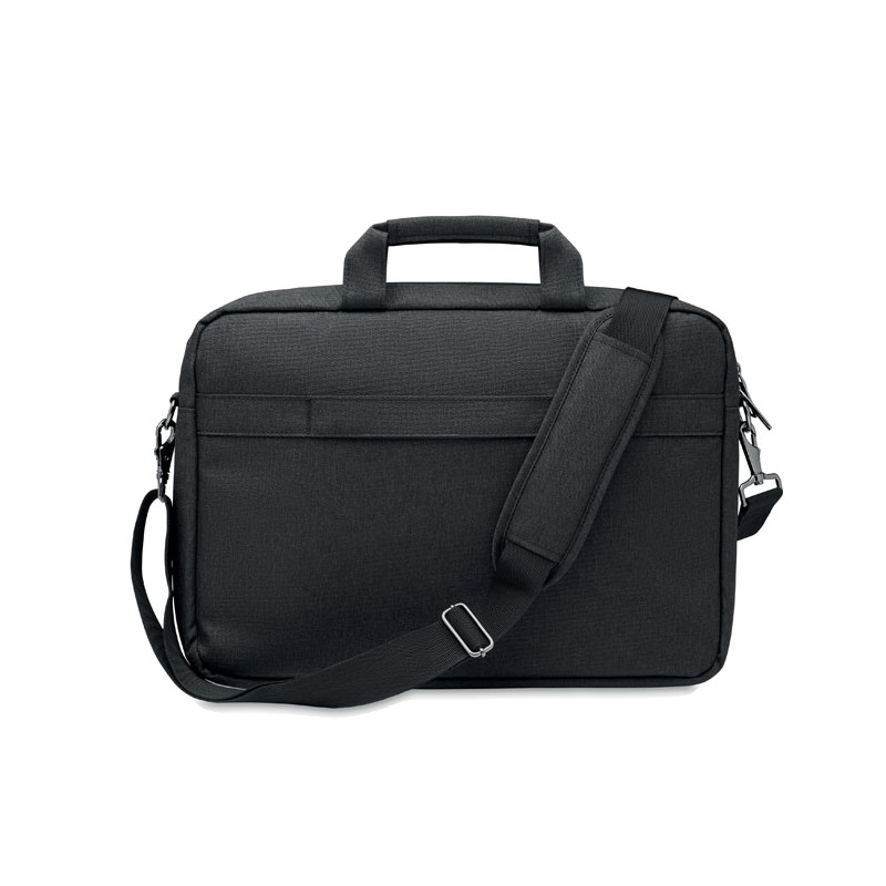 Sacoche ordinateur portable 15'' en polyester 600D RPET. 2 compartiments internes et une grande poche frontale zippée. Une petite poche zippée. Bretelles détachables et réglables. Sangle trolley au dos.
