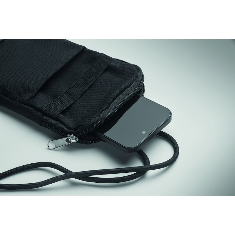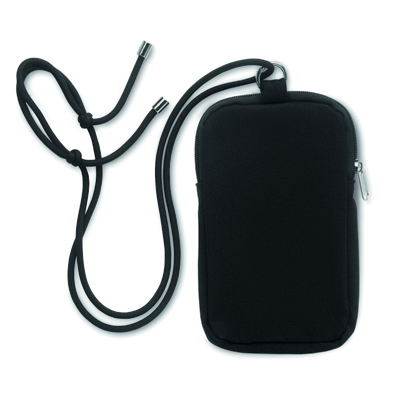 Pochette bandoulière pour smartphone en coton recyclé avec lanière réglable en polyester RPET et poche ouverte sur le devant. 280 gr/m².