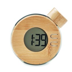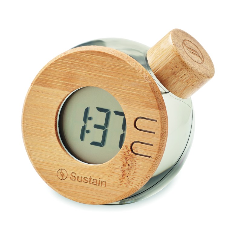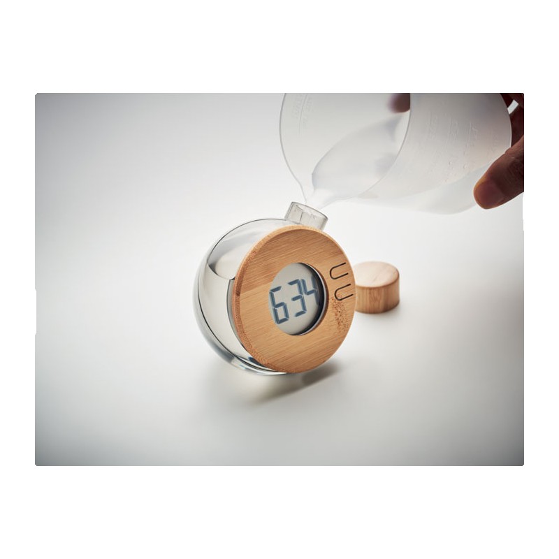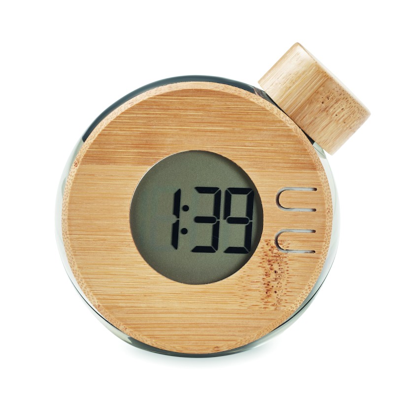 Horloge LCD à grand affichage avec détails en bambou. Aucune pile n'est nécessaire pour alimenter ce produit, seulement de l'eau salée (eau et 3gr de sel) ! Le bambou est un produit naturel, et présente de légères variations de couleur, de décoration et de tailles.
