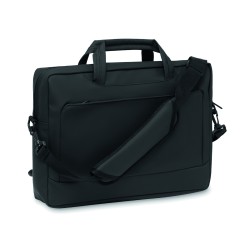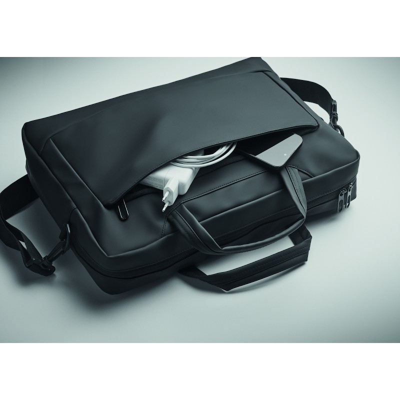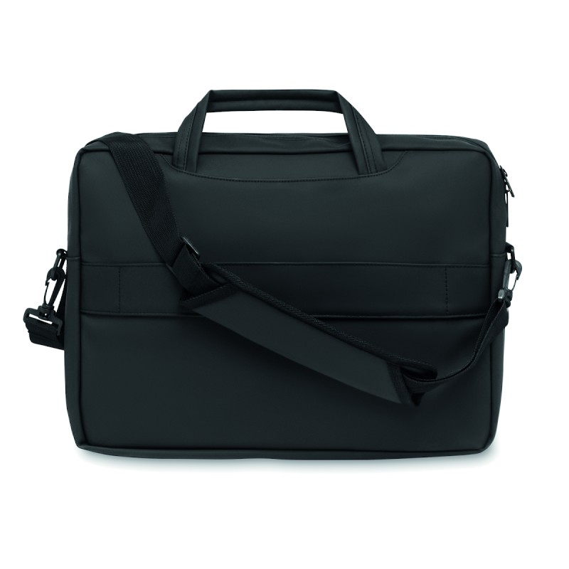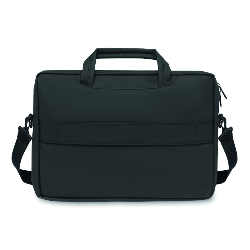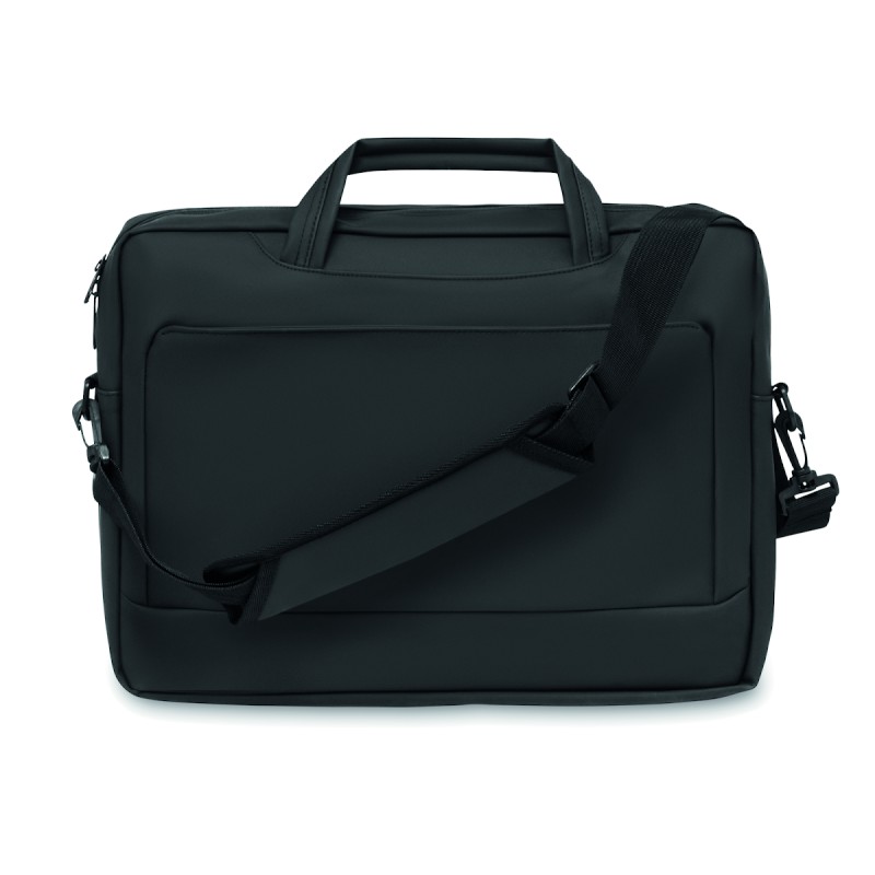Sacoche pour ordinateur portable 15'' en PU souple avec dos rembourré. Un compartiment principal rembourré pour ordinateur portable et une poche avant zippée avec plusieurs compartiments. Doublure en polyester RPET 210D. 2 poignées et une bandoulière réglable et amovible et passant pour trolley au dos.